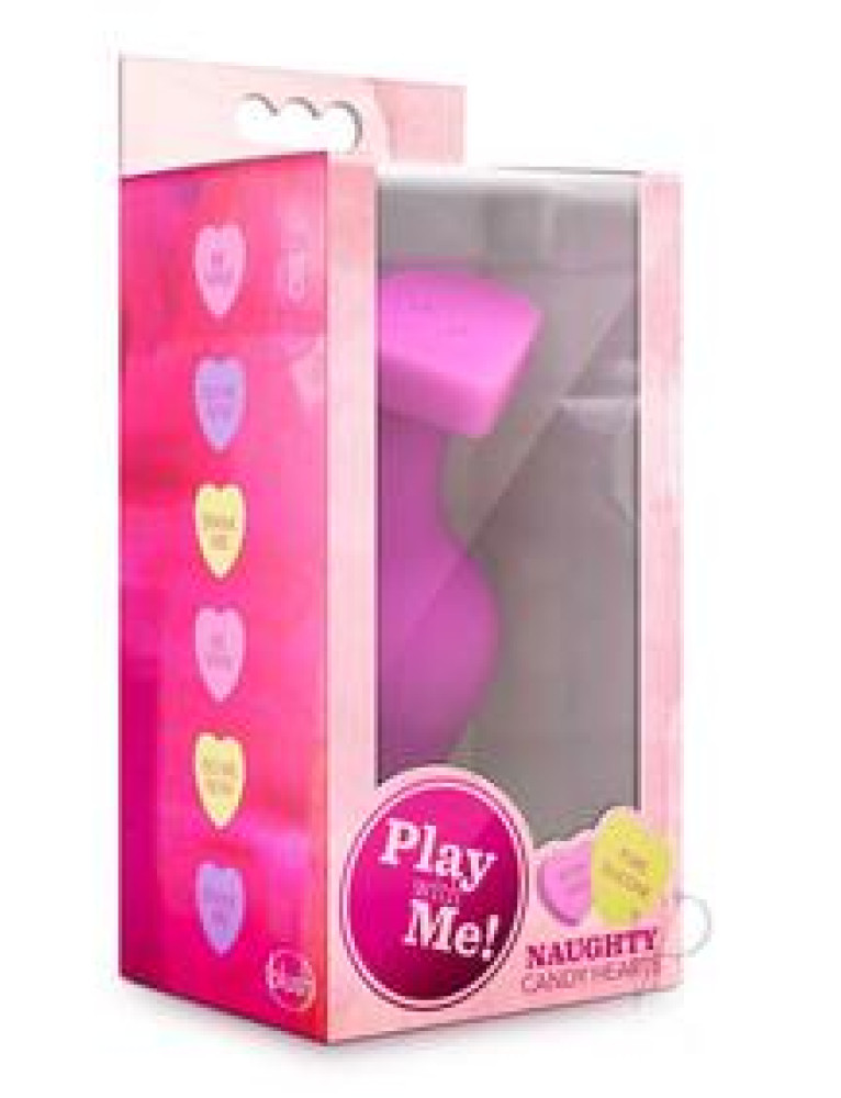 Sex should be fun, so we created Naughty Candy Hearts.These cute little plugs are the perfect gift for your lighthearted lover.Made from soft and flexible silicone with a safe heart-shaped base.With their smooth satin finish, they have a buttery soft touch that becomes slick with lube.Made of 100% silicone, they are hypoallergenic, nonporous, and boilable.Say what you really mean with 3 messages ranging from sweet to saucy:Pink: Be Mine. Purple: Do me Now. Yellow: Spank Me.The words are molded into the product, so they won`t wear off with time.It`s the best way to express yourself! Their size also makes them perfect for anal beginners. Dimensions:Length: 3.5 in.Insertable Length: 3.25 in.Width: 1.5 in.