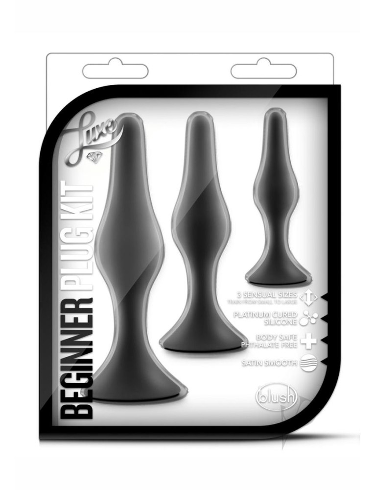 The Luxe Beginner Plug Kit is the perfect starter set for safe and gentle booty play. Each butt plug features a tapered tip for easy ion and a tight neck for gentle pressure and extended wear. With three graduated size, the Luxe Beginner Plug Kit lets you start small and work your way up comfortably. Made of satin smooth, platinum cured silicone, these toys are body safe and easy to clean. For the best experience, use with your favorite high-quality water-based lubricant. Dimensions: Insertable Length: 2.25, 3.5, 4 in. Length: 3.25, 4.25, 5.25 in. Width: .75, 1, 1.25 in.