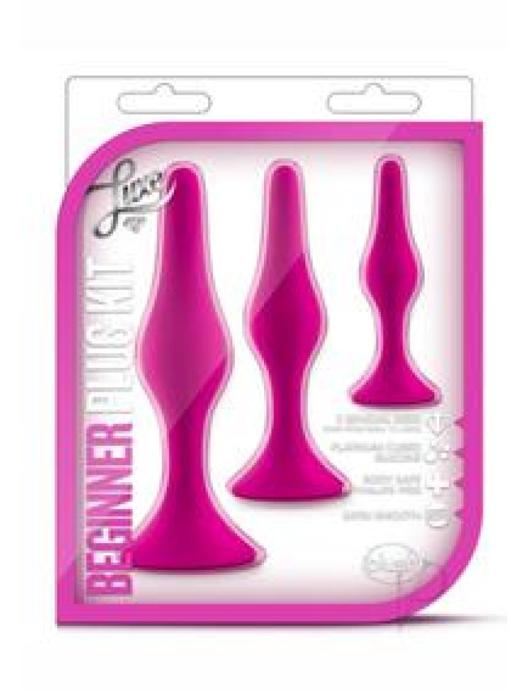 The Luxe Beginner Plug Kit is the perfect starter set for safe and gentle booty play. Each butt plug features a tapered tip for easy ion and a tight neck for gentle pressure and extended wear. With three graduated sizes, the Luxe Beginner Plug Kit lets you start small and work your way up comfortably. Made of satin smooth, platinum cured silicone, these toys are body safe and easy to clean. For the best experience, use with your favorite high-quality water-based lubricant. Dimensions: Insertable Length: 2.25, 3.5, 4 in. Length: 3.25, 4.25, 5.25 in. Width: .75, 1, 1.25 in.