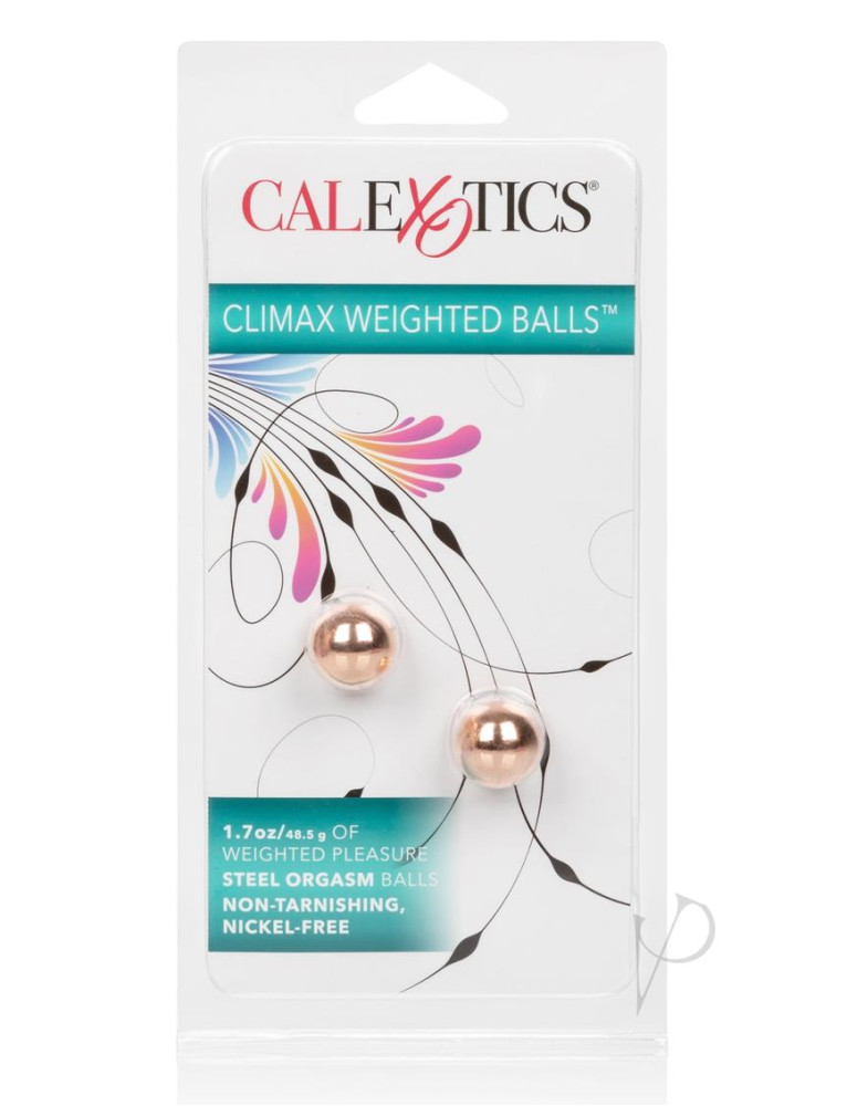 The blushing Climax Weighted Balls are sculpted to naturally increase stimulation, improve sexual satisfaction and increase pelvic muscle strength. Increase sexual arousal and delightful stimulation as the petite weights ripple in harmony with your every movement. Naturally tone and tighten pelvic muscles to improve orgasm intensity and reduce risk of incontinence. The carbon-free steel is electroplated for a blushing copper color. Each weight diameter measures 0.75 (2 cm). Dimensions: Ball Diameter: 0.75 in. Package: 1 x 4.25 x 8.5 in.