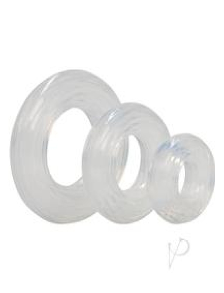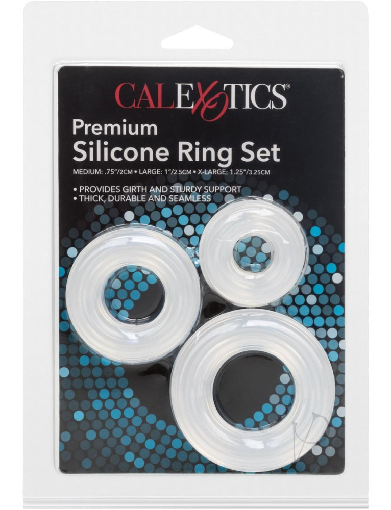 Satisfy your lover`s erotic demands with the versatile Premium Silicone Ring Set. The 3-piece set comprises of medium, large and XL sized penis rings designed for increased girth and stamina support during prolonged intimate pleasure.The set is made from soft and smooth, hygienically superior silicone, for a comfortable fit and pleasurable wear. The transparent, super stretchy rings are ultra thick, totally seamless and sensually contoured to ensure maximized satisfaction. Prepare to enjoy a peak performance that goes on and on.The durable and sturdy rings offer endless possibilities to spice up your bedroom routine. Let your imagination run wild and explore fun and creative ways to wrap up your member. The easy to use enhancers are perfect for prolonged intimate encounters with your lover. To heighten sensitivity, always use a quality lube with these enhancement toys. Before and after use, clean the stretchy cock rings with a toy cleaner spray, or wash in mild soapy water. Size 1 / 2.5cm (Large Ring Diameter) 0.75 / 2cm (Medium Ring Diameter) 1.25 / 3.25cm (XL Ring Diameter)