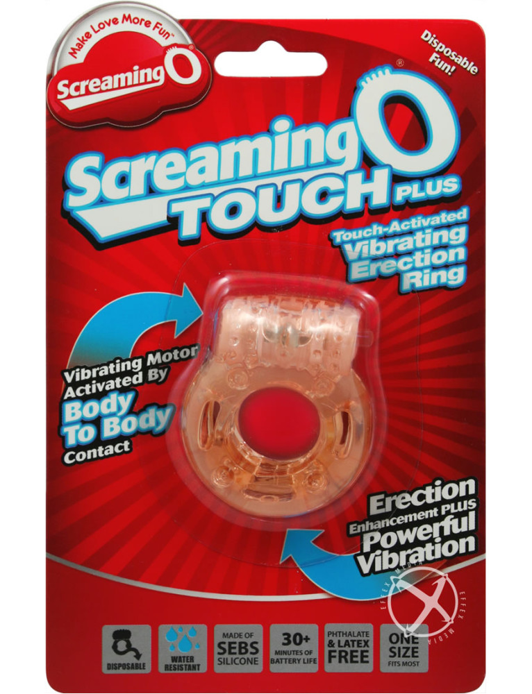 The Screaming O Touch-Plus features soft vibrating pleasure bumps to transfer the stimulating erotic vibrations to the clitoris during sexual intercourse. The Screaming O Touch-Plus has a strong, comfortable, stretchy gel band for a snug fit for longer, thicker, fuller erections on demand. The Touch-Plus is a comfortable fit for any size penis.