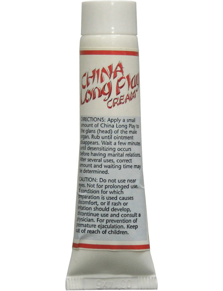 Stay hard...longer! Since ancient times in China, special ointments have been used to increase sexual endurance. Today, this advanced formula cream contains benzocaine to lightly numb the penis in a very light mineral oil base. Apply a small amount of China Long Play to the head of the male organ. Rub until ointment disappears. 0.5 oz tube.
