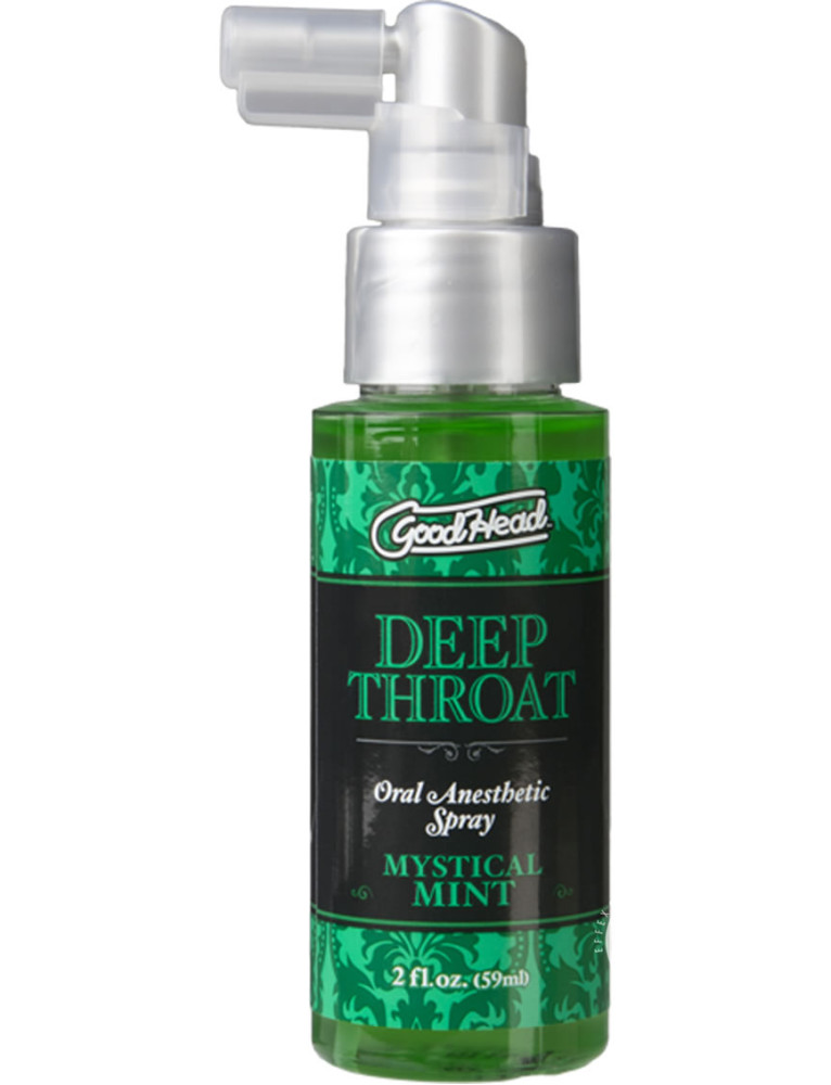 Everyone loves good head, but many people find it difficult to accommodate their partner`s full manhood. Doc Johnson presents GoodHead Deep Throat Spray, a delicious throat desensitizer that will help to alleviate your gag reflex during oral sex, turning good head into great head. Delicious and functional. What more could your partner want in an oral sex aide? Available in 4 delightful flavors: Mystical Mint, Sexy Cinnamon, Sweet Strawberry, and Wild Cherry. 2 oz. bottle. Proudly Made in America.
