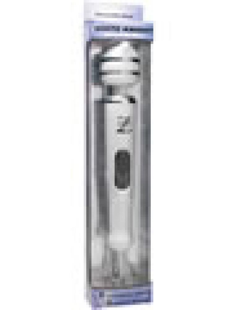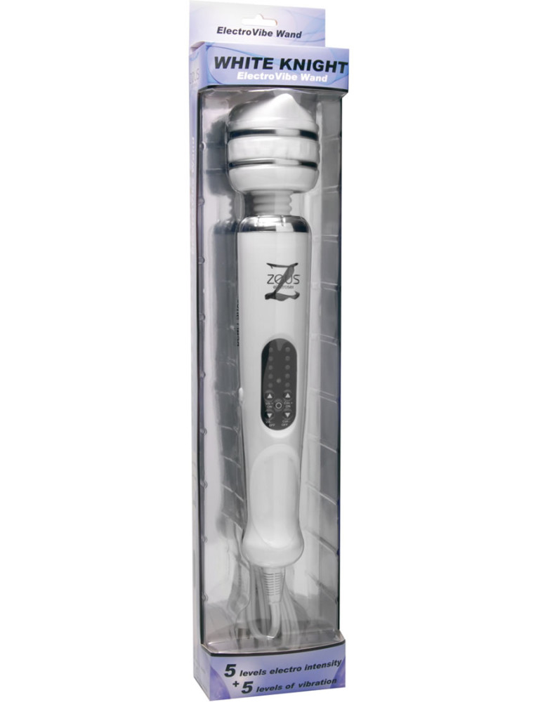 With the White Knight Electro Wand from Zeus, you get precise electro stimulation coupled with powerful vibration, anywhere you want it! Simply control the flow of vibration and electro excitement via the control panel located on the front. This exclusive wand features 5 levels of electro and vibration intensities, each independently controlled with their own button. You can choose to have both on a the same time, or one by itself. With the side boost button, you can create your own pulse pattern by pressing whenever you want a jump. The uniquely shaped silicone head features a pointed, contoured tip and texture elements for the ultimate in targeted stimulation. Size Total Length: 12.75 Diameter: Head measures 2.3