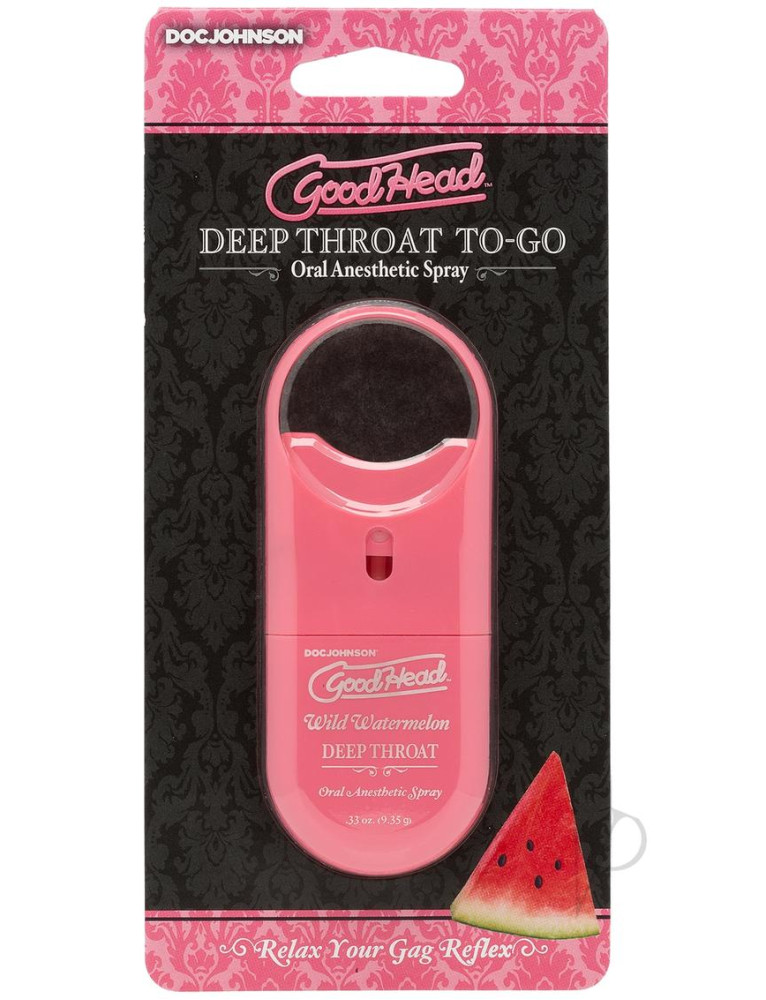 Go down easier. GoodHead Deep Throat Spray mildly numbs the back of the throat and suppresses the gag reflex to allow deep oral penetration without discomfort. This functional, flavorful spray in a convenient travel size is formulated for minimal medicinal taste and maximum effect in a variety of mouthwatering flavors. Delicious Throat Desensitizer Helps Minimize Gag Reflex Mild Numbing Agent Pocket-Sized Freshens Breath Easy-To-Use Spray Application Proudly Made in America