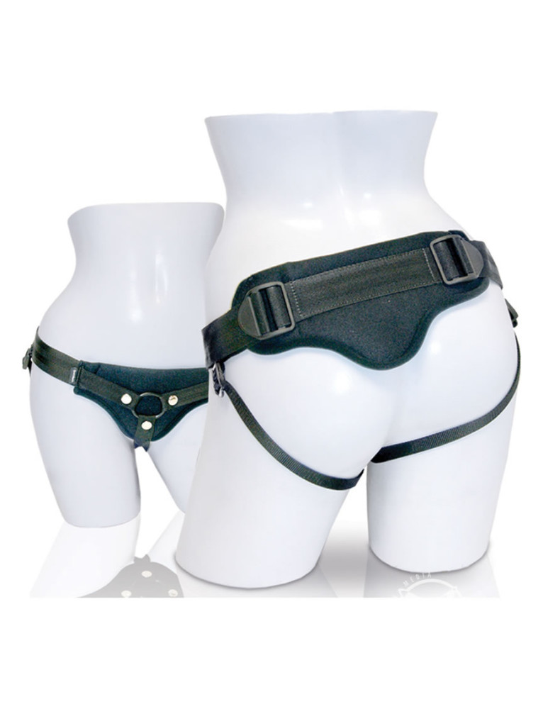 4-way adjustable harness fits up to 82 waist and 44 legs. Padded back support. Includes 3 interchangeable rubber o-rings (1.5, 1.75, and 2). Accommodates any dildo with a flared base.