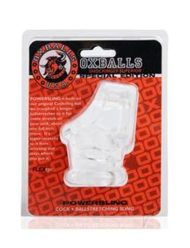 POWERSLING is a special limited edition Cock Sling modeled after our discontinued, best-selling NUTTSLING. Itandrsquo;s made from our signature FLEXtpr so itandrsquo;s rubbery and squishy but still firm enough for a sweet stretching sensation. The soft, flexible material and sling design grips your junk and pushes your package up and out for a bigger bulge. The extended base of the sling keeps your balls pushed down and away from your body. An inner ring in the stretcher grips your sack and keeps your balls in place. FEATURES: Made of soft, rubbery FLEXtpr that stretches to fit. Modeled after original Cock Sling-2 with built-in Ball Stretcher. - Redesign of our best-selling older model NUTTSLING. Special, limited edition run available now. TOY DIMENSIONS: Width: 1.5 - 2.25 in.Height: 2.75 in.Main hole circumference: 4 in.Shaft hole circumference: 3.75 in.Ball hole circumference: 3 in. PACKAGING DIMENSIONS:Height: 5.25 in.Width: 4 in.Depth: 2.5 in.