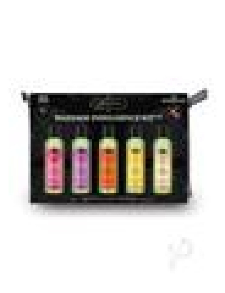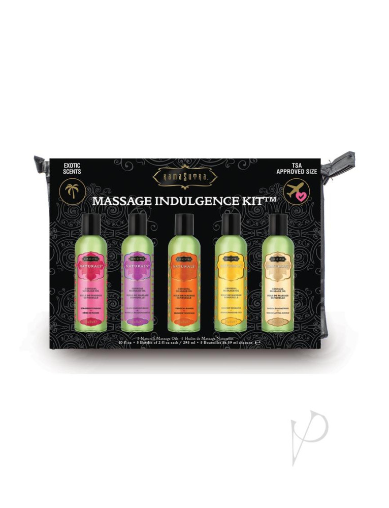 Try all five blends of Kama Sutra Naturals Massage Oil with this travel kit. Includes five petite massage oils in a zippered case. The TSA approved sizes are perfect for travel. Made with naturally-derived oils, these rich, emollient formulas make it a pleasure to give or receive a romantic full-body massage, wherever you go. Made with naturally-derived oils and skin nourishing Vitamin E Ultra moisturizing and silky-smooth for the perfect full body massage Travel-sized and TSA approved 2.0 fl oz (59 ml) SCENTS STRAWBERRY DREAMS - The fragrance of sweet, juicy, ripe strawberries. TROPICAL MANGO - A sweet blend of tropical fruits with strong notes of mango and a hint of peach. COCONUT PINEAPPLE - Melt-in-your-mouth coconut cream with a splash of juicy pineapple. VANILLA SANDALWOOD - Creamy vanilla with exotic sandalwood. ISLAND PASSION BERRY - Luscious passion fruit, succulent papaya and juicy berry with a hint of mango.
