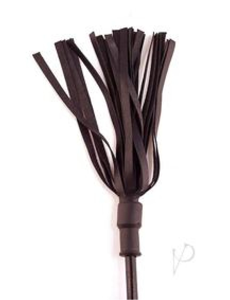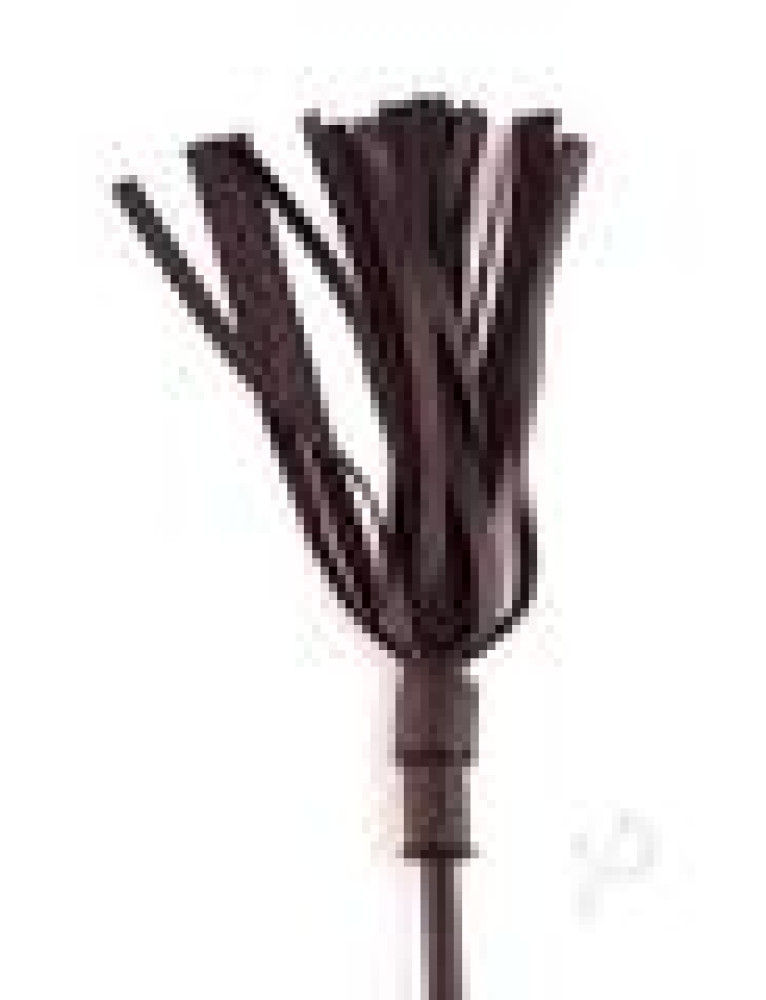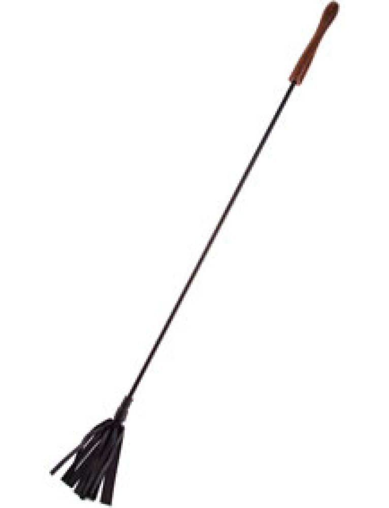 Riding crop with a feathered leather strips and rounded wooden handle.