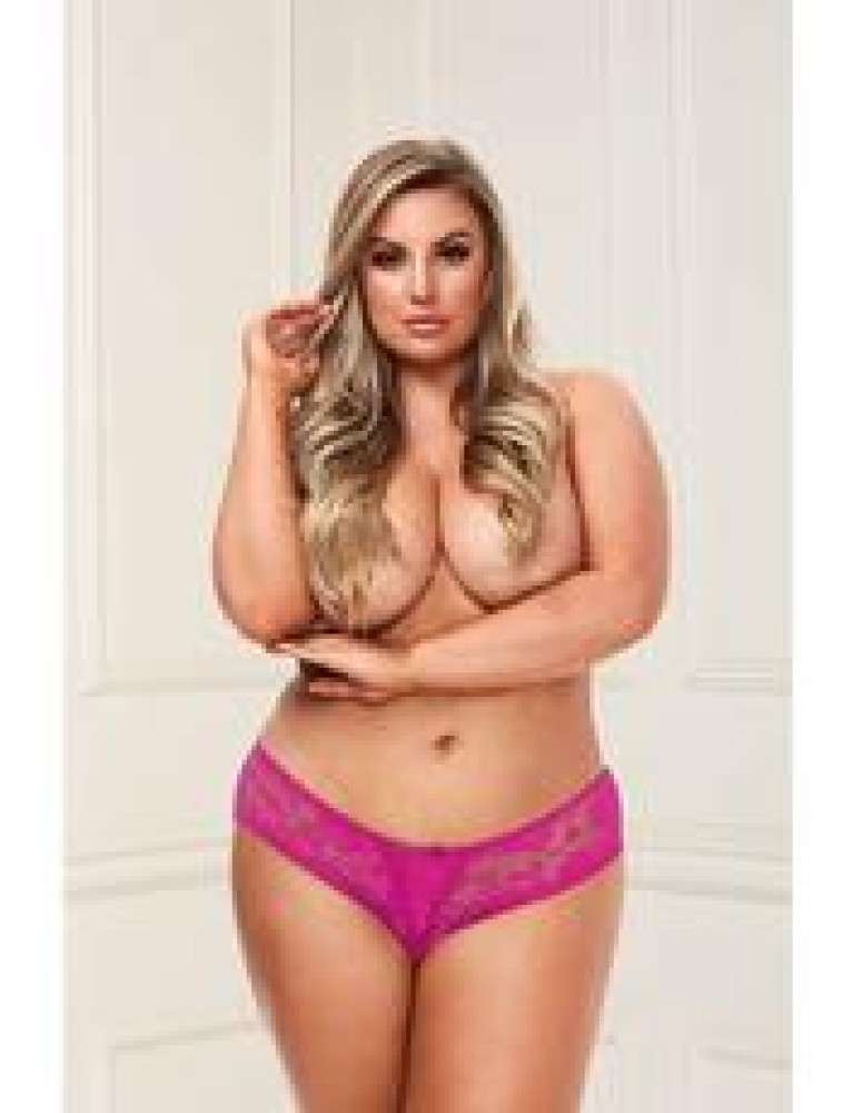 This low rise, full lace panty has its own dirty little secret; an open crotch design! Made of sheer, delicately crafted lace, and available in ebony black, hot pink, and deep blue, this cheeky pancy sits low across the hips and fits playfully across the curve of your derriere, accenting all the right places!