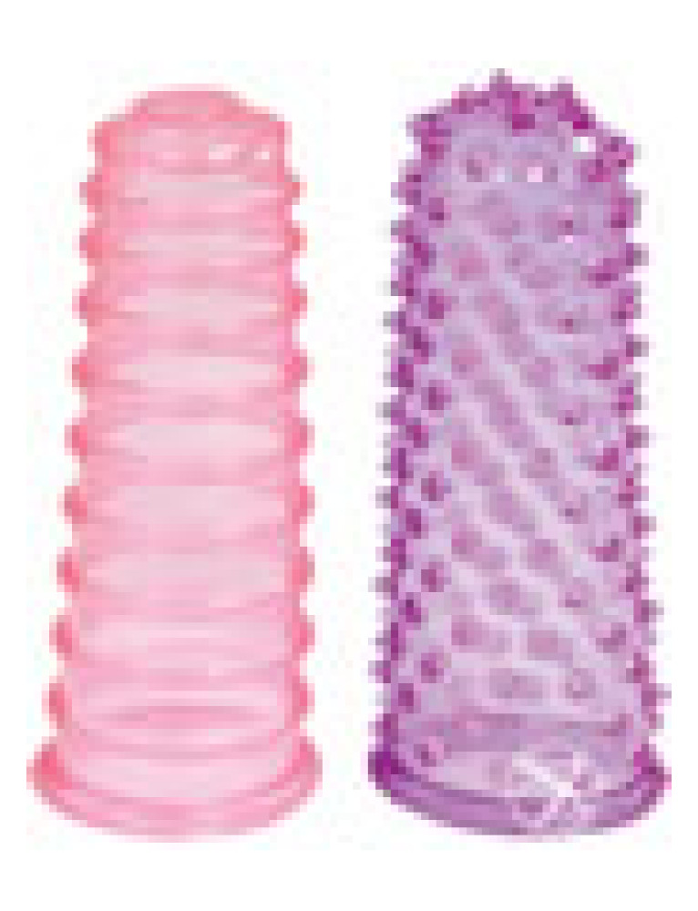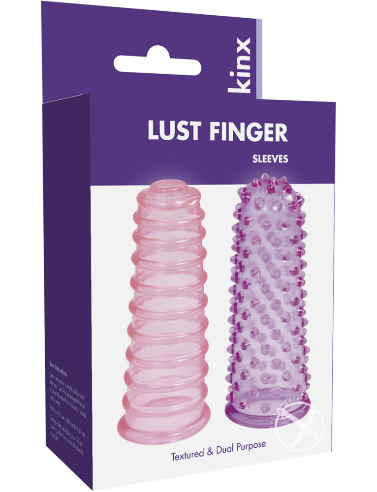 Lust Fingers - Purple. These Lust Fingers give you lust at your fingertips. This two-pack of clit-stims contains a pink ribbed and a purple nubby version. Let your fingers do the talking.