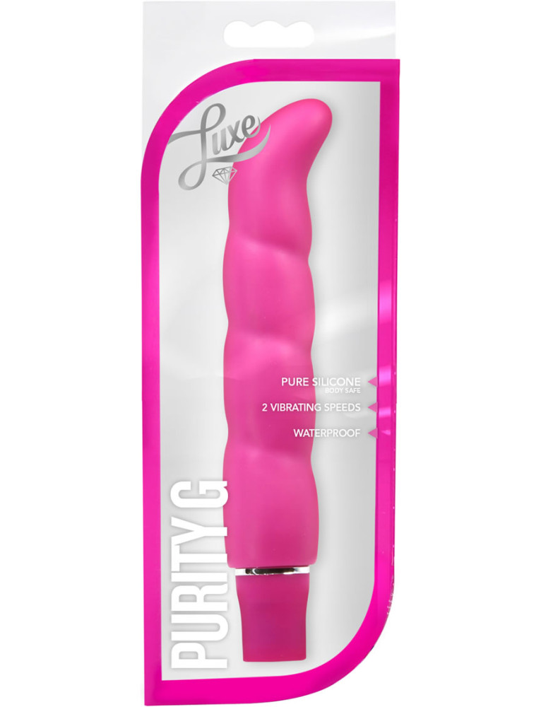 Purity G`s seductive shape expresses the spirit of Blush Novelties` Luxe line. Gorgeous to behold and sensuous to the touch with a smooth satin finish, Purity G stands 6.25 inches with 5.25 inches of accessible play. Set in motion her duet of push button vibrations with 1 AA battery, sold separately. Made of pure body safe silicone, the vibrations radiate freely over the spirals and the ergonomic g spot curve. Purity G has a waterproof motor to ensure safe shower play. To cleanse Purity G run water and apply a mild soap or wipe with a choice toy cleaner, then let air dry. Enjoy peace of mind with our 5 year warranty!