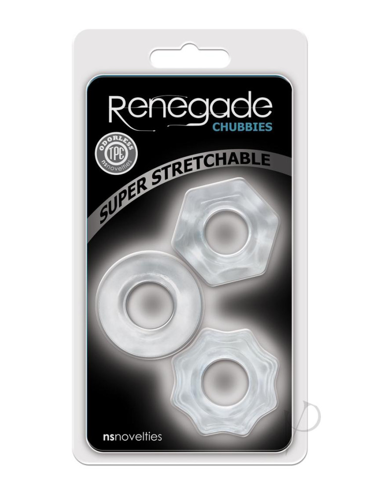 Comfort and control delivered by Renegade Chubbies. Super elastic, these stackable rings have multiple uses. Body safe TPE is suitable with all lubricants.
