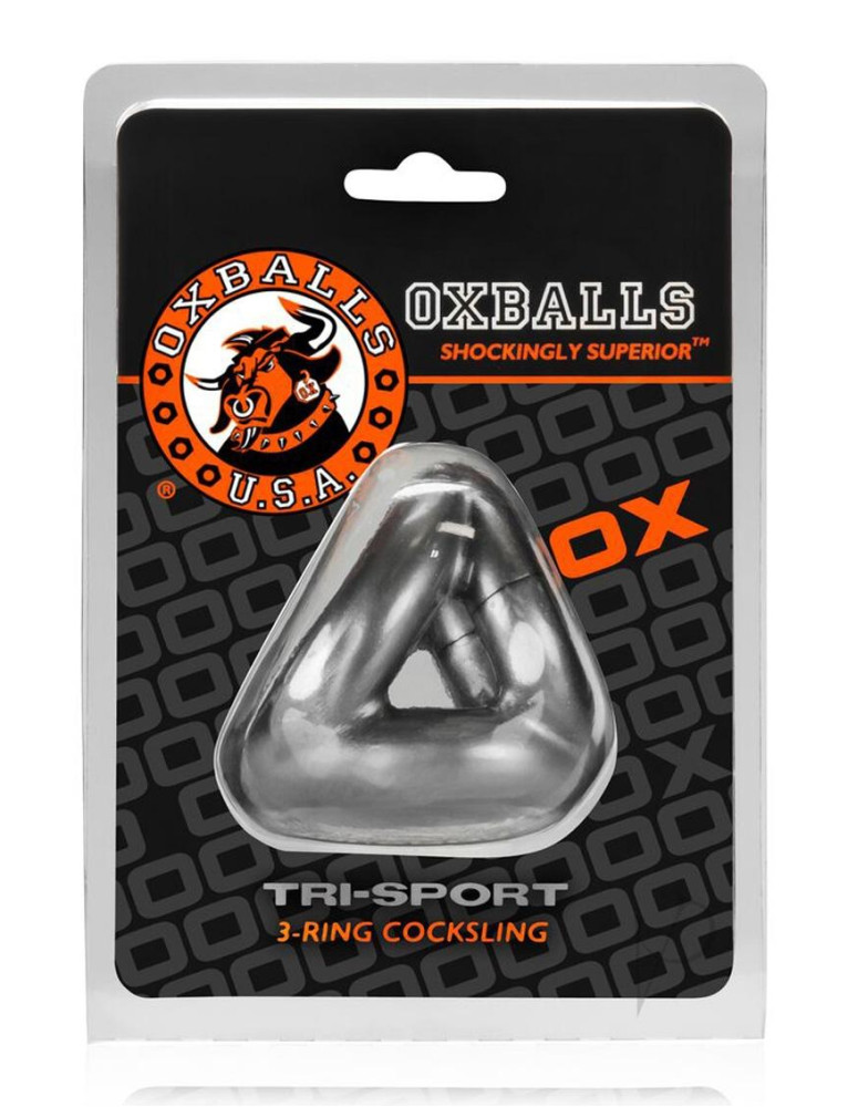 TRI-SPORT is OXBALLS` take on traditional metal tri-cockrings. Best of all, it`s made from our signature FLEXtpr so there`s no need to worry about trying to wrestle your junk into uncomfortable, rigid rings. TRI-SPORT`s super-soft material and unique 3-ring sling design grips your meat for a harder, longer lasting erection and creates a bigger, more pronounced bulge. Each ring is a different size so it can be rotated and worn to best fit you.