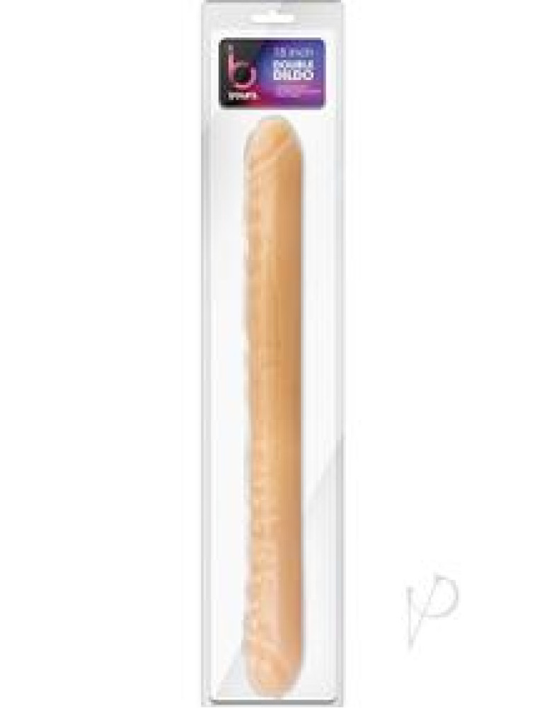 Double your pleasure with our 18 inch Double Dildo. Perfect for lesbian couples that both enjoy penetration, this double dildo allows you to be pleased at the same time. With 18 inches total length to share, that leaves 9 inches for each of you. This Double Dildo is realistic with a pronounced head on each end to increase pleasure. Our double dildo is also flexible enough to be used for double penetration. Made of fragrance and Phthalate Free PVC: this toy is body safe and easy to clean! Just wash with warm soap and water, or your favorite toy cleaner, before and after every use. Pat dry with a soft towel before storing.