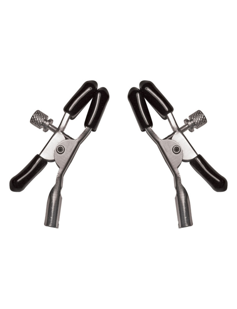 Adjustable metal nipple clamps with rubber tips. - 85% Nickle-free metal- 10% PVC- 5% ABSPinch her to see if she`s dreaming - then pinch her again.