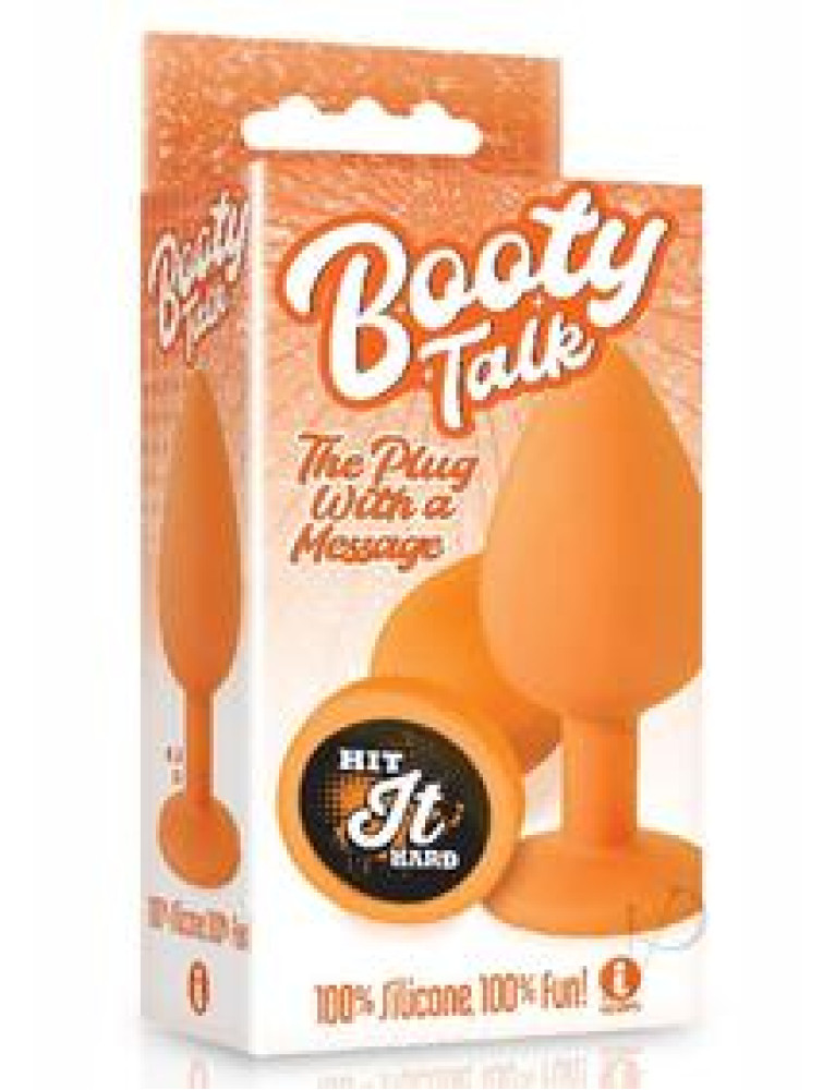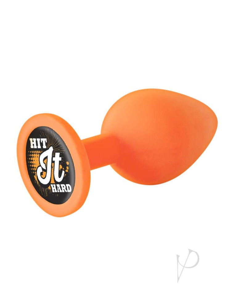 The Nines Booty Calls Butt Plug Orange Hit It Hard from Icon Brands. Made using body safe phthalate free materials Silicone. The plug with a message on base HIT IT Hard. 100% silicone. 100% fun. Only use a water based personal lubricant.