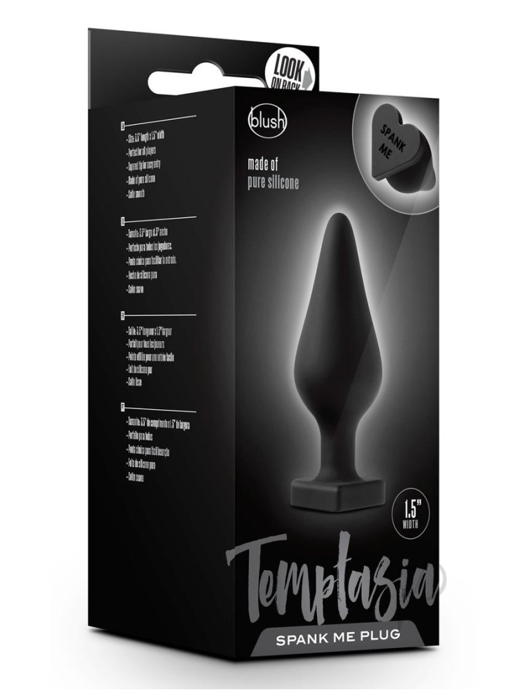 The Temptasia Spank Me Butt Plug is the perfect gift for your lighthearted lover. Made from flexible silicone, this sultry plug features a safe, heart-shaped base. Its satin smooth finish has a buttery-soft touch that becomes slick with lube. The Spank Me Plug`s body is tapered for easy ion and features a comfortable average girth at the bulb. Made of 100% platinum cured silicone, this toy is hypoallergenic, non-porous, and easy to fully clean. Say what you really mean with the Temptasia heart plugs messages: Spank Me, and Fuck Me. The words are embedded into the base, so they won`t wear off with time!