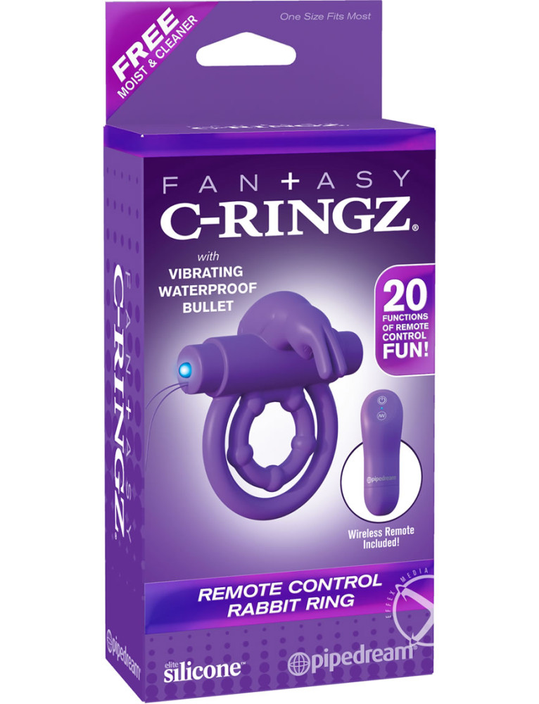 The days of men controlling the remote control are over! Introducing the Remote Control Rabbit Ring, the amazing couples-friendly rabbit-style ring that puts your partner in total control of the fun! Driven by an RC frequency that works up to 25 feet, this wireless cock ring is the perfect couples toy that will add a new dimension to your lovemaking! Take control of the remote yourself or surrender it to your partner and give them total control! The wireless remote allows you to cycle through 20 thrilling pulsation patterns to find a function that`s just right for you! You control when and how often the rabbit vibrates, while you both enjoy the kind of sex youve only dreamt about.Hell enjoy thicker and fuller erections, prolonged ejaculations, and an overall boost in confidence! She`ll enjoy super powerful clitoral vibrations directly positioned on her sweet spot. You both will enjoy taking turns who gets to control the remote!Made from body-safe, phthalate-free Elite Silicone, this ring easily stretches for maximum comfort. The top ring wraps snug around your shaft while the bottom ring wraps around your whole package. The fluttering rabbit ears are carefully positioned to stimulate her clit, while the super-stretchy ring puts a squeeze on performance letdowns. He`ll be bigger, thicker, and harder than ever before, while she enjoys wall-banging climaxes and mind-blowing orgasms.