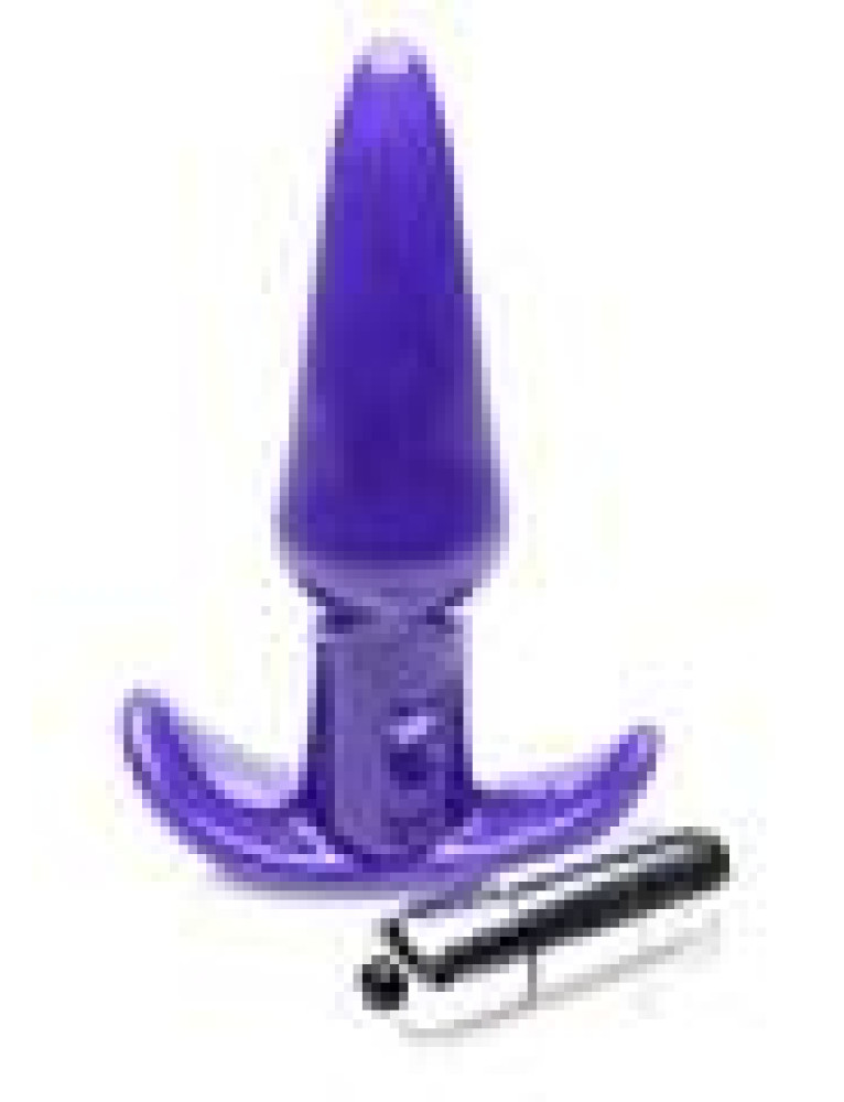 The thrilling thrums of this smooth butt plug are perfect for an anal amateur or a booty boss! A tapered tip coupled with the sleek material allow for a comfortable penetration, while the narrow base is shaped perfectly to fit between your cheeks. A one-speed bullet is included that can be ed at the bottom of the plug. With the simple push of a button you can fill your hole with humming heaven. It is even waterproof to allow for wet, hot fun in the shower or jacuzzi! This firm, but flexible butt plug is phthalate-free and compatible with silicone and water-based lubricants. Clean with mild soap or a toy cleaner.Measurements: Plug is 4.8 inches in total length, 4.5 inches able length, 1.25 inches maximum diameter, .75 inches minimum diameter. Bullet is 2.3 inches in length, .7 inches in width. (Circumference 2.355)Material:Â TPE, ABS PlasticColor:Â PurpleNote:Â Bullet requires 3 LR44 batteries, included