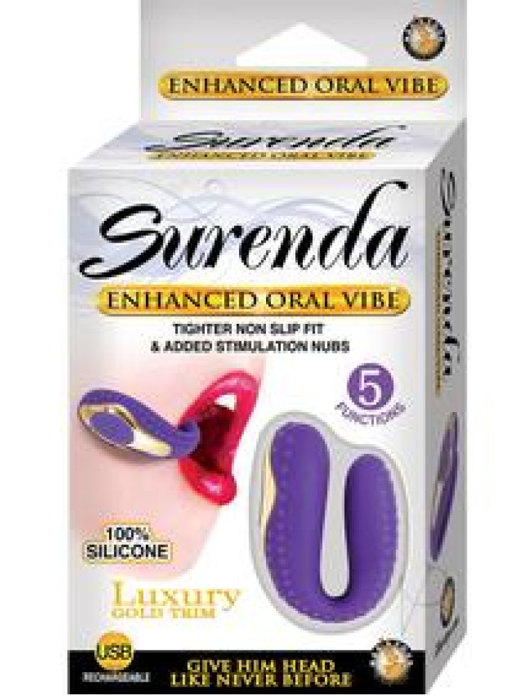 Surenda Enhanced Oral Vibe Purple with Luxury Gold Trim. Features: 5 functions 100% Silicone USB cable included Waterproof