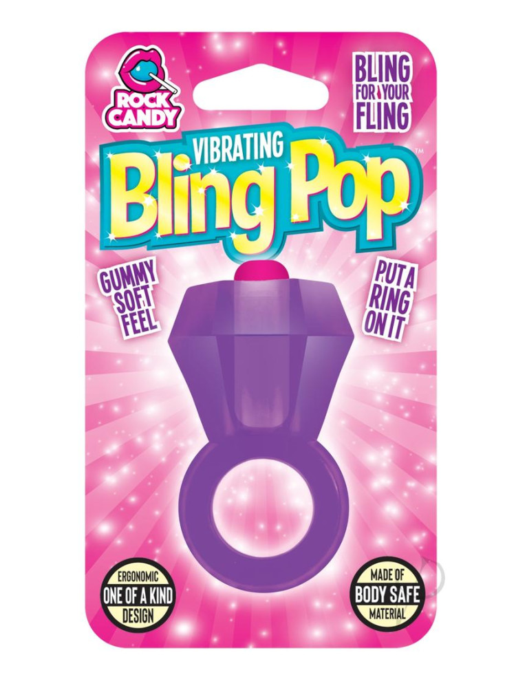 Diamond-shaped vibrating erection ring Add a pop of bling to your fling! The one-of-a-kind Rock Candy Bling Pop is a true gem of a sexual enhancer, engineered to resemble a classic hard candy silhouette and colorful aesthetic, while incorporating power and comfort. Fit the supple ring down and around the base of the penis, or include the testicles-- and keep the diamond on top to treat your partner to blissful clitoral stimulation. Flip it upside down for external perineum stimulation, or double-loop it around the finger for solo or partner play! The high-powered single speed motor does double duty, serving up pleasure for two with the simple push of a button. Slide on it or grind on it...our ultra luxe diamond does what a good diamond does...performs best under pressure! - Unique, powerful vibrating ring enhances couple`s play - Density of gummy texture specially formulated for durability and functionality - Can be worn around the base of the penis, or the testicles and the penis - Super stretch ring provides a comfortable fit - Crafted from bodysafe TPE (thermoplastic elastomer) - Single speed motor provides 50+ minutes of power - Splashproof - Replaceable batteries included - One size fits most - Available in Blue, Pink, Purple and Red Dimensions: Diamond-shaped vibrator: 2.5 at widest, 1 tapered base Inner ring diameter: 1.75 Packaging dimensions 3.5 x 6