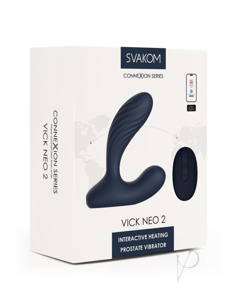 andbull;Powerful vibration and 38anddeg;C heat in a twistable, textured design.andbull;Magnetic remote control and color-changing lights on base.andbull;Pair with the SVAKOM App to customize or play long-distance.andbull;Sync toy movements with interactive adult videos or cam sites. Vick Neo 2 delivers powerful vibrations to your prostate and perineum for dual pleasure. The textured shaft twists 180anddeg; and heats to 38anddeg;C while the base has colored lights for each mode and magnetically holds the remote control. For more options, use Vick Neo 2 with the SVAKOM App, and compatible adult videos and cam sites. Extra features: Intelligent Mode, waterproof design, USB-recharging, battery lights, memory function and travel lock.