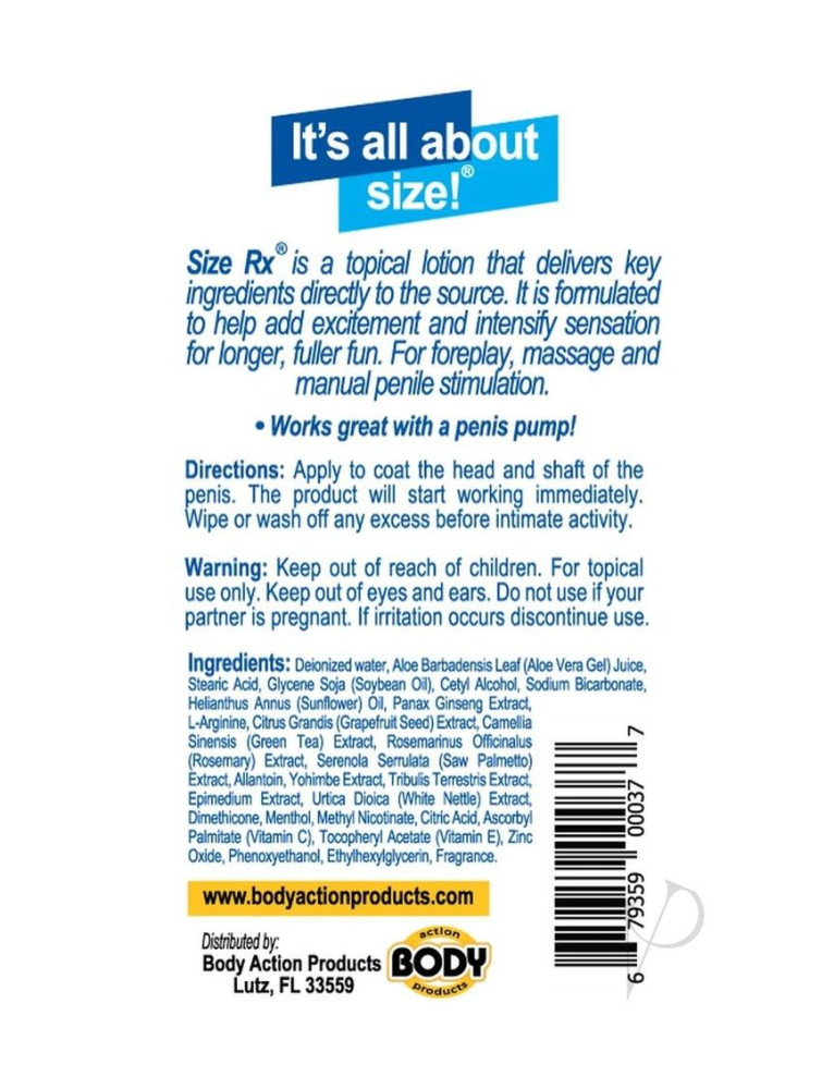 Size Rx Penile Enhancement Formula is a topical lotion that was specifically formulated to last up to 24 hours, and to help open blood vessels and expand capillaries. This formulation improves sensation and firmness. Even without an erection you will notice more fullness and added size.