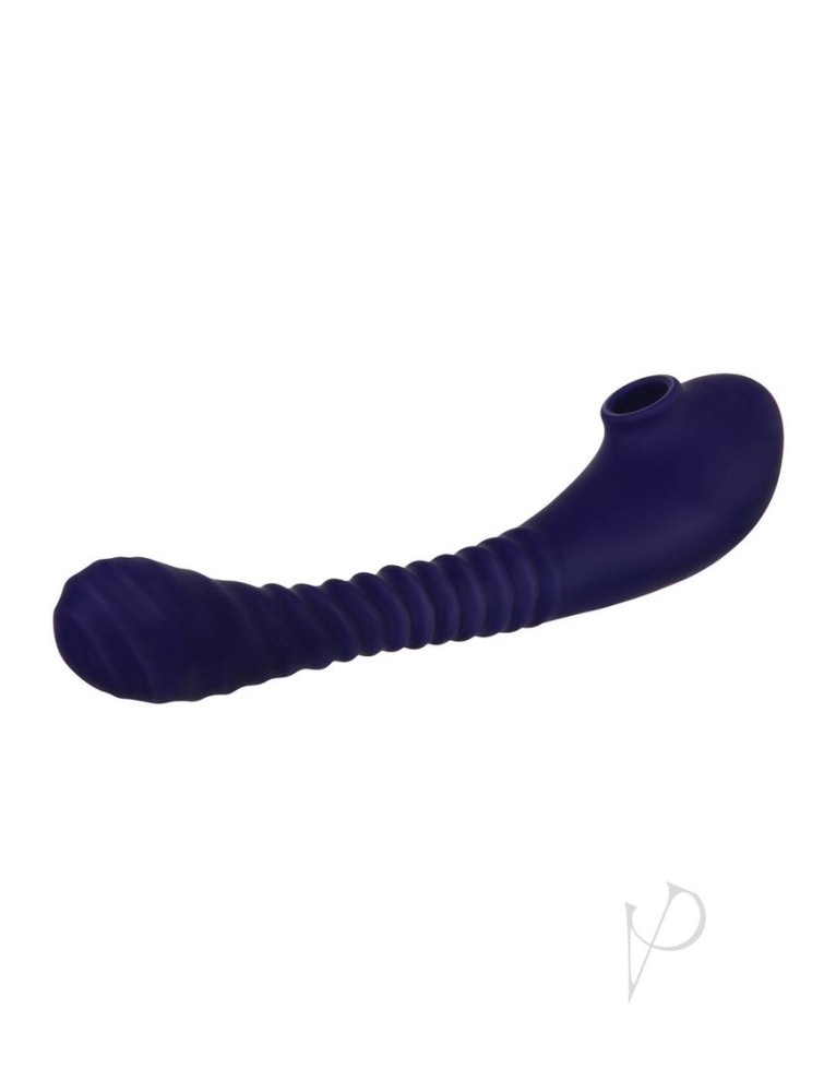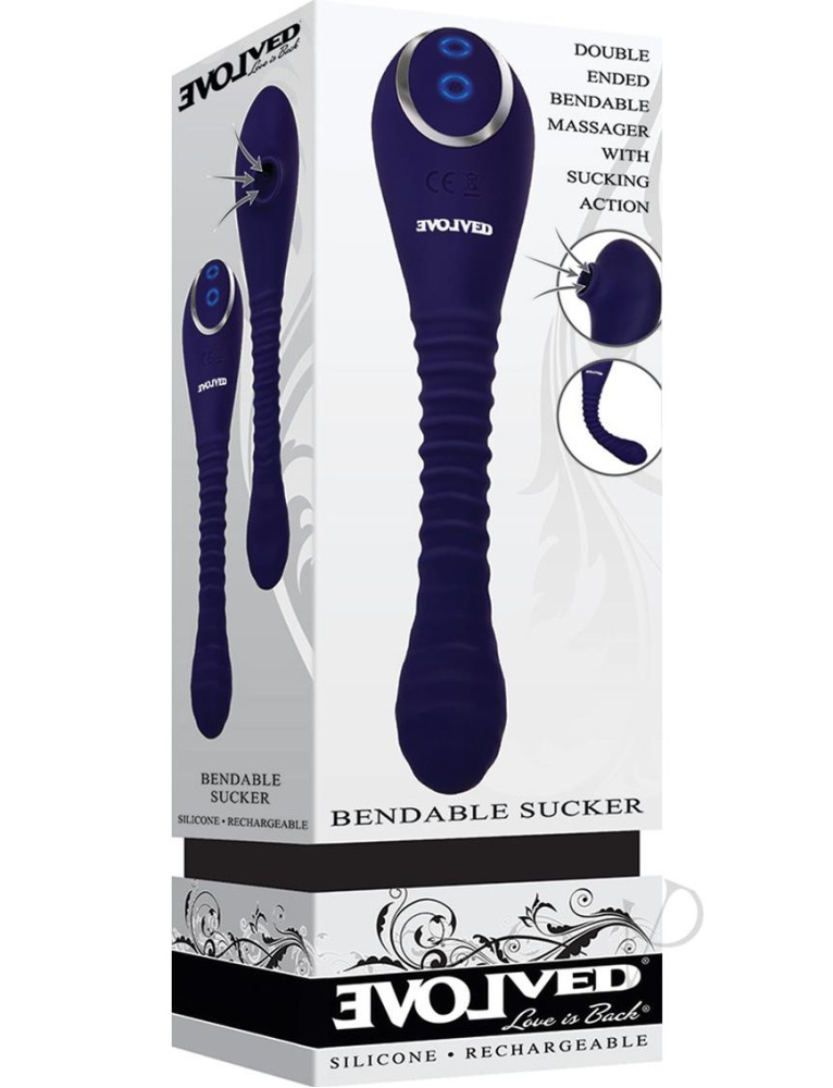 This double-ended toy features a suction stimulator on one end and a powerful ribbed vibrator on the other.Experience undulating waves of suction that tease and target the clitoris with an extraordinary touch-free feeling that builds intense pleasure in even the most sensitive people.Flip the toy to enjoy the slim, textured vibe on the opposite end, and experiment with all the dual possibilities in between!The two sensations are joined with a flexible, posable shaft that bends to your needs, allowing unique hands-free positions.Fully rechargeable and easy to clean with Evolved Toy Cleaner and a warm water rinse. Double ended suction vibrator Suction function one end, vibrating on the other Touch-free suction air pressure targets clitoris Great for sensitive people who prefer indirect stimulation Powerful ribbed vibrator at other end Textured shaft andamp; head for extra sensation Bendable poseable shaft for hands-free options 5 sucking speeds andamp; functions 8 vibrating speeds andamp; functions Easy to use 2-button control Blue LED illuminates buttons when in use Made from creamy smooth silicone Detail made from durable ABS plastic Stylish chrome-finished controls Splashproof, not submersible Phthalate andamp; latex free USB rechargeable, cable included Length: 8.75, Depth: 1.97, Width: 1.88 Insertable length: 6 Weight: Under .5 lb.