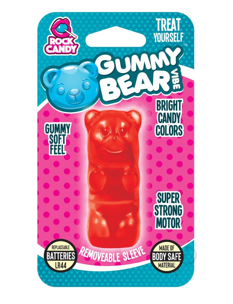 Realistically-shaped Gummy Bear Bullet VibratorSweet dreams are made of these! The Rock Candy® scientists have created the Gummy Vibe®, a powerful pocket-sized vibrator that you have to feel to believe! The Rock Candy Gummy Vibe puts a sweet face on a powerful clit stimulator that`s so good, you`ll want to skip dinner and jump straight to dessert. (They look good enough to eat, but these handheld treats aren`t edible!) The snuggly-soft bear nuzzles the clitoris with a textured snuggle nose`, providing discreet yet intense, powerful vibrations directly to your sweet spot. with a single-speed bullet. The lifelike gummy texture and playful design brings an element of whimsy to solo pleasure or partner play. Hold a squishy soft Gummy Bear on the nipples for extra erogenous stimulation, or against the side of the mouth during oral sex! Give our fun-sized Gummy bear sex toy a try, and you`ll realize that a bedroom without one of the world`s most popular candy treats is simply unbearable! Now packaged in a compact card for easy retail hanging on any grid or slatwall. - Realistically-shaped mini gummy bear vibrator- Contoured grooves provide additional stimulation- Realistic, gummy soft TPE- Ultra-powered motor packs a sweet punch- Discreetly sized for travel- Splashproof design- Available in Blue, Pink, Purple, and RedDimensions:Total length: 2.5Carded packaging measures 3.5 x 6