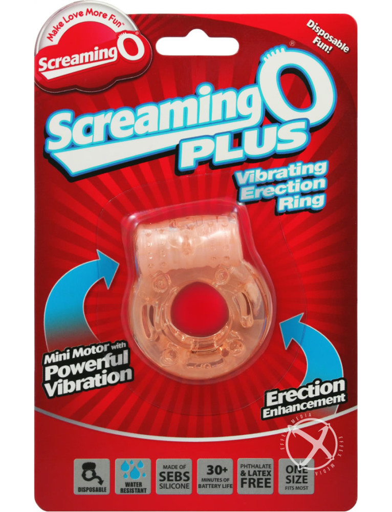 The Screaming O Plus vibrating cock ring is designed with a specially enhanced silicone gel ring effectively prolonging the duration and firmness of the male erection increasing pleasure for both. The Screaming O Plus also stimulates the female clitoris with extended ticklers to deliver greater sensations and orgasms. One time use only. Duration of intense vibrations: 25 minutes.