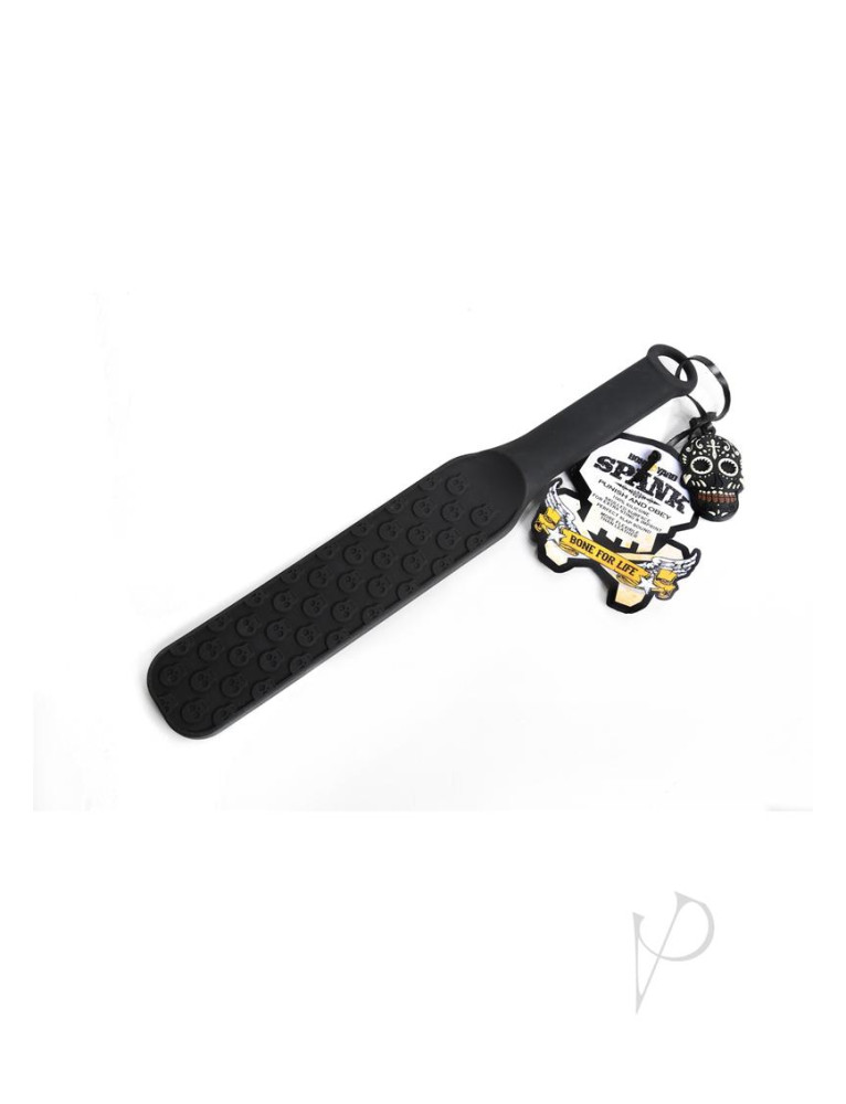 14.75 (37.5mm) in length2.25(5.7mm) wide 100% Silicone Skulled Surface for Extra Sting and Imprint More Flexible than Leather Spank is a paddle for the beginner to the most advanced enthusiast. It is made from 100% soft touch silicone with a matte finish. The flexible Spank is a rectangular shaped paddle with rounded edges. Spank features a large hanging loop with a collectible skull.This product is completely hypoallergenic, non-irritating and compatible with sensitive skin. Care Instructions:Wash thoroughly with mild soap and warm water or toy cleaner. Pat dry and allow product to completely air dry. Store separately.