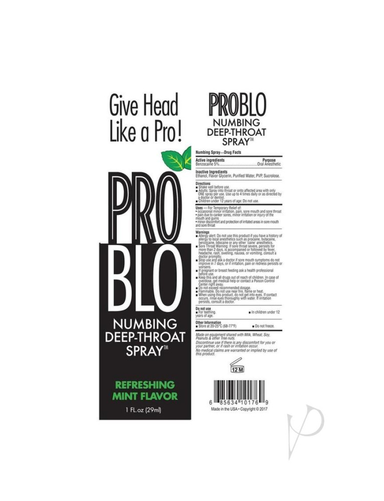 Blow your man`s mind with the best oral sex of his life! Just a squirt or two of this numbing spray will allow you to give a better blow job by desensitizing your gag reflex, making it easier to take it longer and deeper than you ever have. Pleasant flavors make you kissable and him gulpable. Use ProBlo for more intense oral play. Comes in Refreshing Mint and Sexy Cinnamon