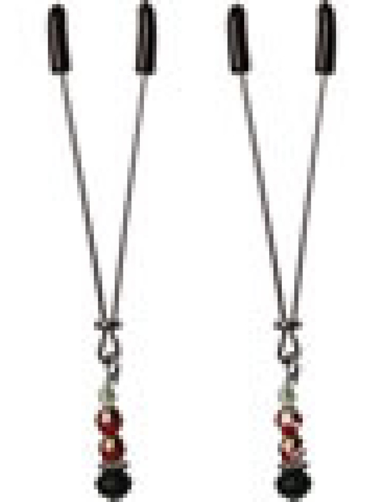 New to nipple play? These Nipple Clamps are perfect for the beginner. Rings slide down the shaft of the tweezer-like clip for as snug as you like sensations. Soft pads at end for added comfort and decorative red and black jewels add decoration.