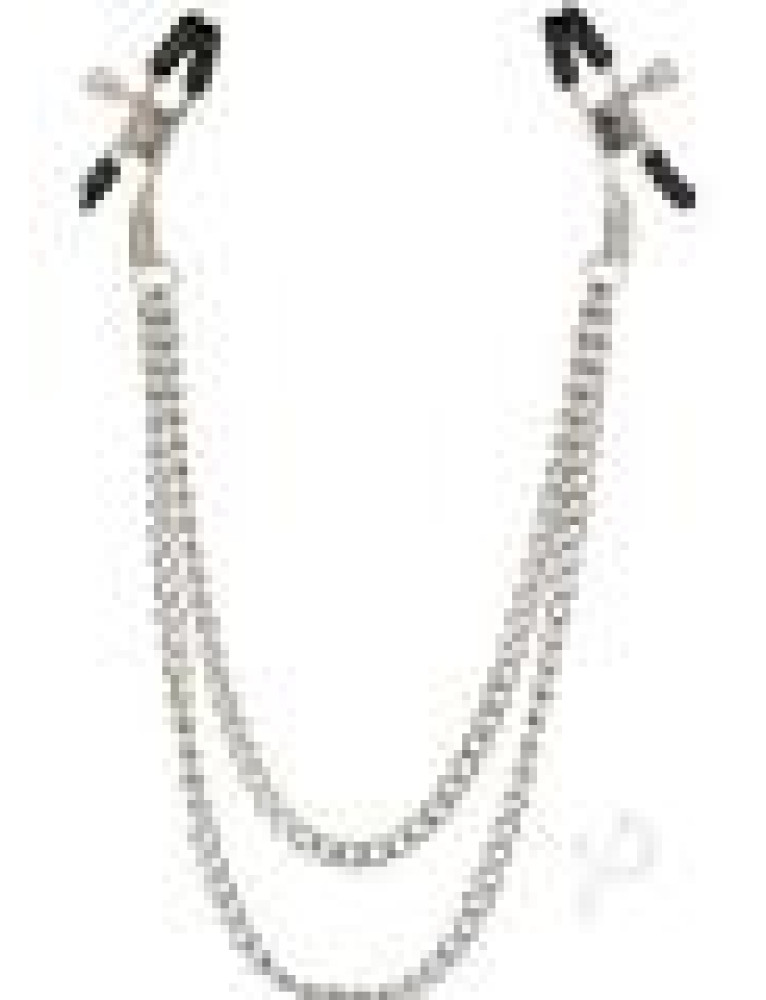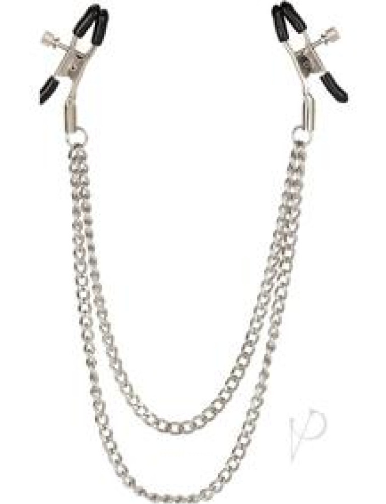 Includes 2 fully adjustable multi-use clamps Soft, comfortable pads Sturdy high-quality dual chain for added sensuality Non-tarnishing, nickel-free Nickel-Free Iron (chains, clamps) Phthalate-Free PVC (pads) 2.25 x 1/5.75 cm x 2.5 cm (each clamp) 15/38 cm (overall length)