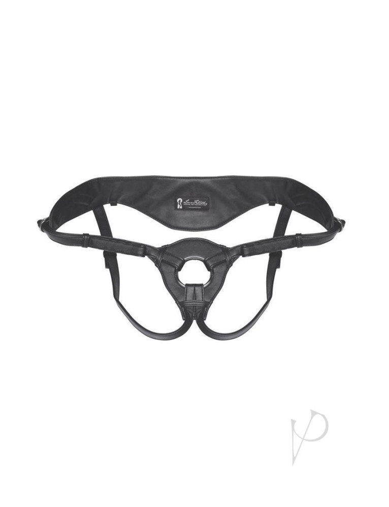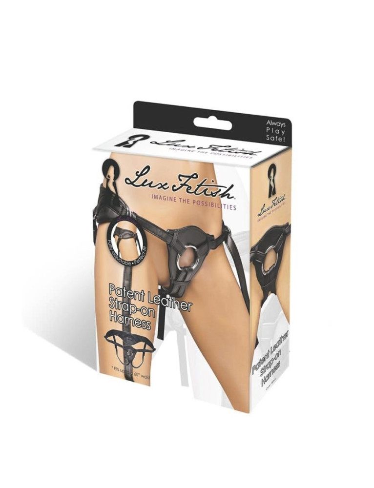 Get deep with the Lux Fetish Patent Leather Strap-on Harness. This sexy, supple leather harness can accommodate any dildo with a flared base, and includes 2 rubber holder rings. Perfect for new initiates just discovering the joys of deep penetration, or for experts looking to add another tool to their arsenal. 4-way adjustable straps fit hips up to 60.
