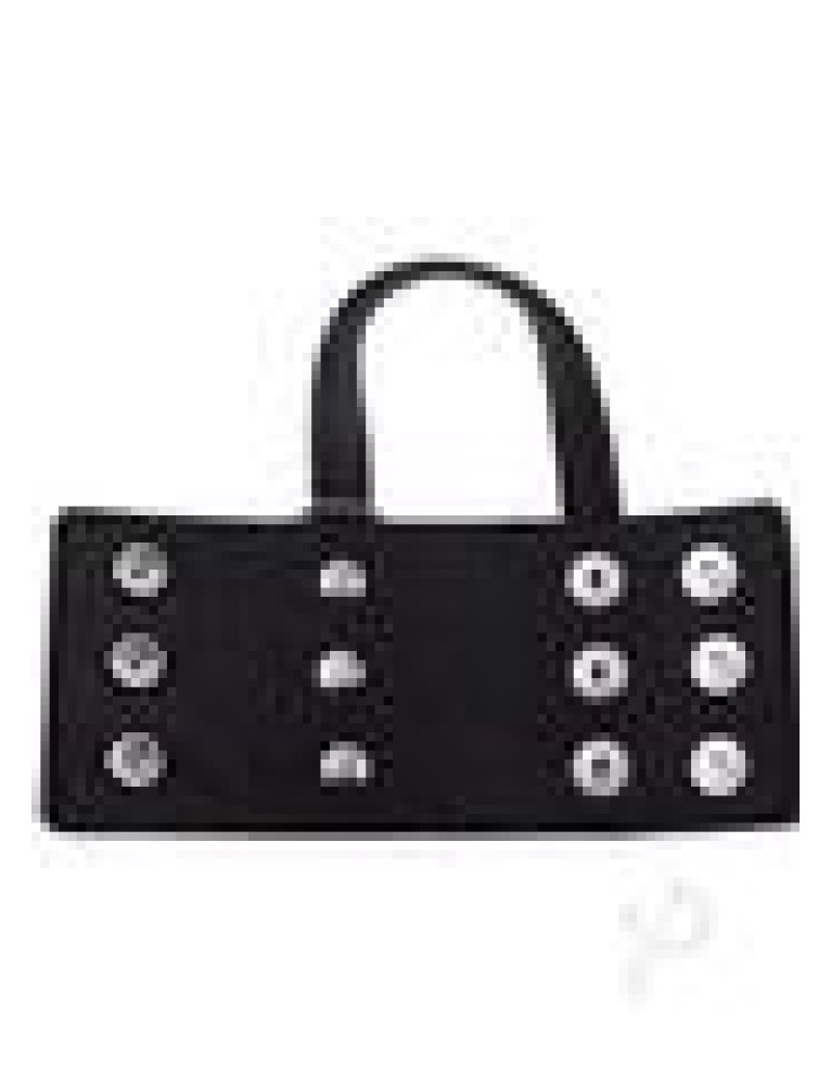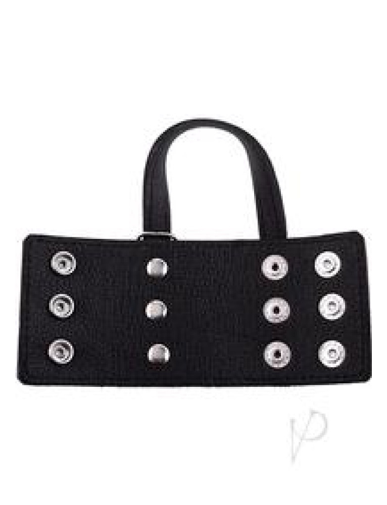Black studded leather ball stretcher with snap button closure.