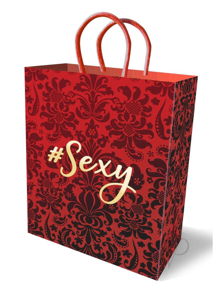 Unlike other gift bags, you`ll be proud to wrap your naughty gifts in these playfully suggestive bags. They look expensive and feel amazing! High quality, unique luxury gift bags made of thick, sturdy card stock paper with elegant woven handles. This Red 10-inch gift bag with black velvet-like flocked fleur-de-lis pattern has an imprinted gold foil stamp #Sexy. This delightful bag is as fun to give as it is to receive.