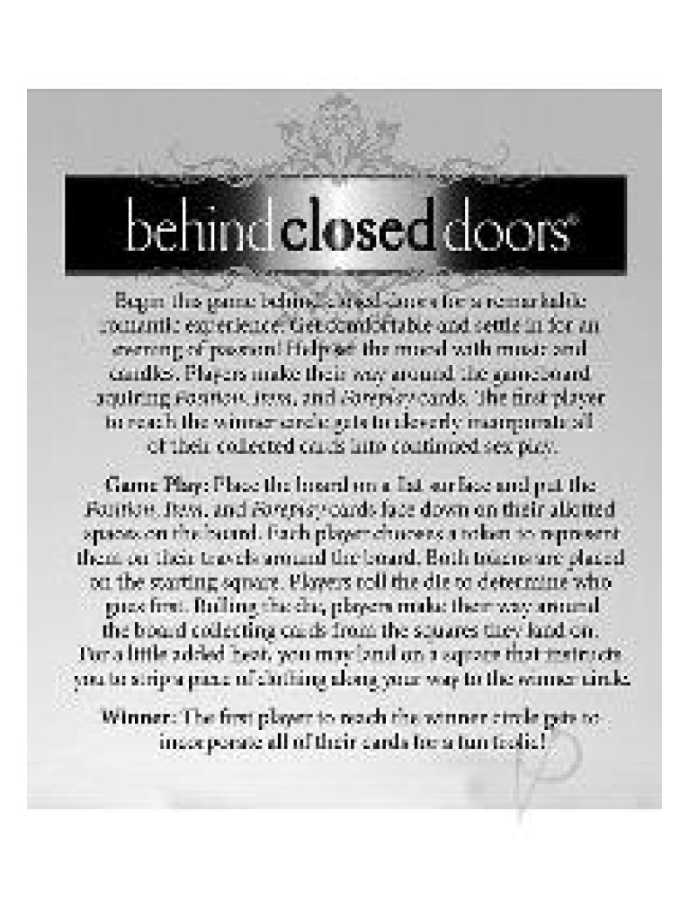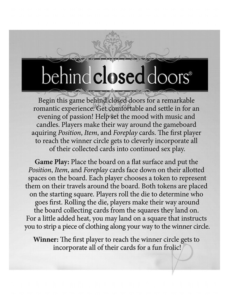 When you play Behind Closed Doors your pleasure begins. Get ready for a night of passion by playing this game for two. With each roll of the dice, advance along the game board to either choose a Position, Item or Foreplay card or strip a piece of clothing. The game winner can use any of their gathered cards in sex play. Varied card combinations make this game different and exciting every time you play.