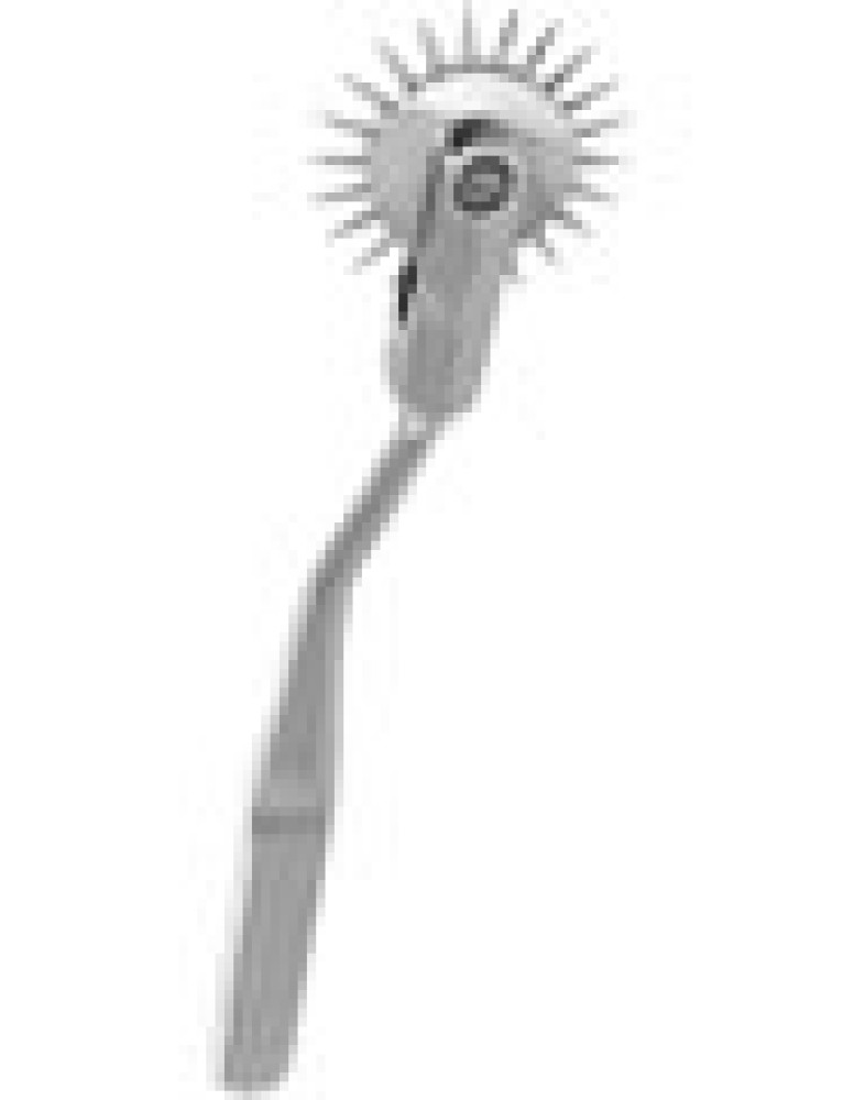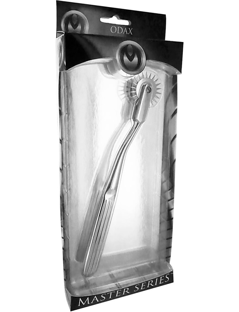 Test the limits of sensitivity play with the Odax Sensation Wheel from the Master Series. Run this premium spiked wheel across the skin and other highly treasured areas for an exciting prickle of pleasure. Made of stainless steel and deviously designed with a row of evenly spaced sharp pins that turn smoothly as it rolls across the flesh, the Odax is ideally designed for intense, exquisite pleasure. Take it to the next level with a little temperature play...the slick material of the Odax can be warmed or cooled for an extra spike of sensation.Measurements: 7 inches in total length, wheel measures 1.2 inches in diameter.Material:andnbsp;Stainless SteelColor:andnbsp;Silver