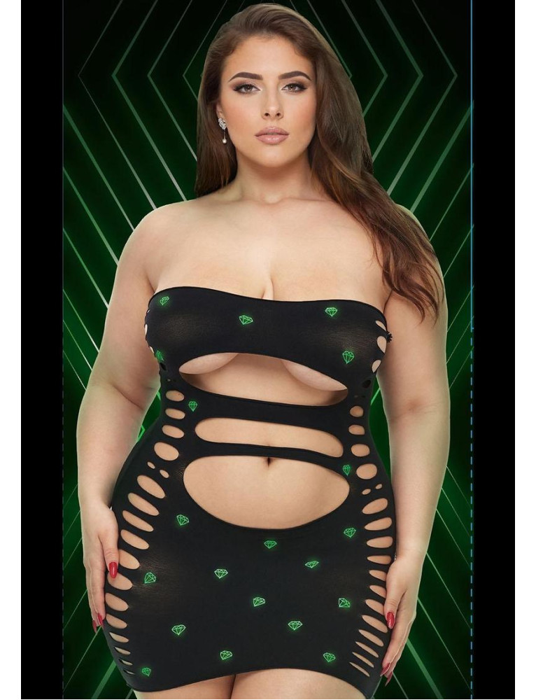 Own the night with the Midnight Diamond Cutout Minidress, a bold, ultra-sexy statement piece designed to illuminate every curve. This strapless mini features dramatic cutout panels along the front and sides, creating an irresistibly daring silhouette. Scattered across the dress are glow-in-the-dark diamond motifs that charge with light and shine brilliantly in the darkperfect for club nights, festivals, parties, or anytime you want to stand out. Crafted from a soft, stretchy fabric that hugs the body, this dress offers both comfort and stunning visual impact. Slip it on, step into the dark, and watch the diamonds come alive. Available in One Size Fits Most and Queen Size. Turn heads. Light up the room. Shine like midnight diamonds.
