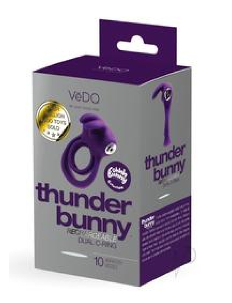 Thunder Bunny rechargeable vibrating ring hops into action with its super powerful motor and 10 vibration modes. Designed to help him stay harder, longer. Simply slide the smaller ring down your shaft, pull the larger ring around your boys and let the vibrating bunny ears work their magic. They will tickle and excite all your partner`s erogenous zones. And don`t be afraid to let your bunny loose in the water, he`s completely submersible. PRODUCT FEATURES Extremely powerful motor Rechargeable (USB cable included) 10 vibration modes One button easy control Extremely quiet Velvety smooth silicone Submersible Running time: 45 mins Dimensions: Length: 3.74 in. Inner Diameter: 1.25 in.