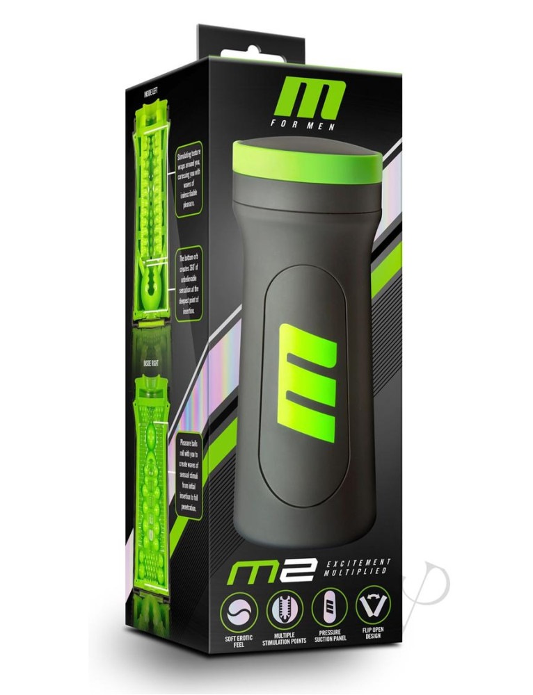 Blush`s M For Men M2 Superior Stroker represents the pinnacle of male pleasure devices. This male stroker will give you orgasms with intensities that are almost too much to bear. Let`s explore together on how it helps you achieve this. The super soft love chambers are made from our iconic X5 materials. X5 was a revolutionary elastomer we formulated in 2008. It has been the cornerstone of our best selling strokers. Now, lets enter the first chamber. We call it the stroke power chamber. This chamber creates a light suction mimicking pursed lips sucking at your penis. Second, we now enter the pleasure balls and nubs chamber. This chamber has soft little orbs and nubs strategically positioned to envelope, caress, and squeeze at your hard shaft. The nubs undulate in harmony with your penis as you stroke in and out. Now, finally we enter the main orb chamber. As your penis head enters it is softly rubbed and squeezed. You will especially feel this as your orgasm when your head is at it`s most sensitive. While all of this is happening you can utilize the squeeze panel. You are in full control where on your penis you want to squeeze and how much you want to squeeze. Imagine, all of these incredible and unique sensations are all happening to your penis everywhere, all at one. Your orgasm will be so intense you will find you might want to back off lest you pass out from pleasure. The flip open design is a marvel in engineering. It`s design will accommodate thicker penises. And makes cleanup quick and simple. The smooth canister fits perfectly in the palm of your hand and has a good weight on it. To use, twist off green ring, then twist off black cap. You can opt to twist back on the green ring for a snugger fit and increased suction or keep it off if you are thicker than average. Apply your favorite water based, silicone or hybrid lubricant. Never use with petroleum or oil based lubes, greases etc as it will break down the material. When done, twist off the green ring, flip open the canister and rinse clean with soap and water. Pat dry with a clean cloth or paper towel. Air dry then twist cap and ring back on. REALISTIC FEEL - Made With X5 Plus Superior TPE for a Realistic and Incredible Feel Against Your Skin SQUEEZE PANEL - Squeeze Anywhere Along The Length Of Your Penis. Have it As Tight As You Want It For Mind Blowing Orgasms FLIP OPEN DESIGN - Accommodates Thicker Penises And Makes Cleanup Quick And Easy. 7 Insertable Inches 3 UNIQUE PLEASURE CHAMBERS - Stroke Power Chamber Creates A Suction Mimicking A BJ. Pleasure Balls andamp; Orbs Chamber Caresses And Strokes Your Penis. Main Orb Chambers Rubs Your Head. All Of These Sensations Are Happening At The Same Time. The Intensity Of Your Orgasm Will Be Too Much To Handle SOFT X5 TECH - Handcrafted From X5 Materials. It`s Soft, Feels Realistic And Lifelike. With Your Eyes Closed It Would Be Hard To Differentiate X5 From The Human Body. Silicone, Water Based And Hybrid Lube Safe