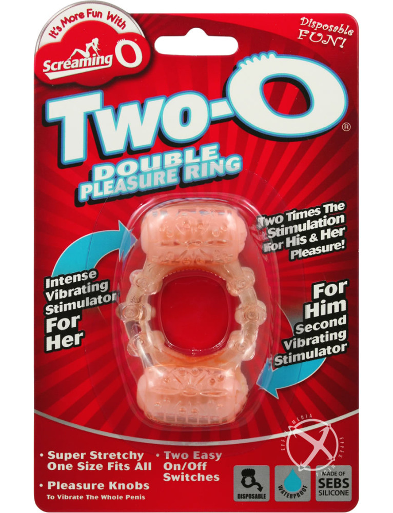 The new Two-O is just like the award winning, top-selling Screaming O vibrating ring, but with an extra enhanced motor designed to double the pleasure for mutual enjoyment. The popular traditional Screaming O ring has one vibrator to be worn on the top for her but the Two-O improves mutual pleasure by adding another vibrator for him. What really makes this ring amazing is the Screaming O`s trademark pleasure knobs that are designed to transfer the vibrations through the length of the penis which are now powered by dual motors to really turn him into a human vibrator!