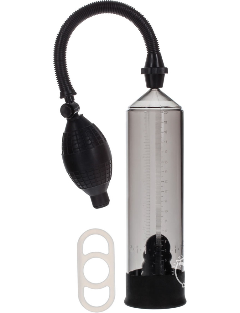 - Pump up your training routine! -American Pumpers Association - Durable cylinder with universal measurements - Silicone sleeve adds superior suction seal and ribbed textures for added sensations - Easy squeeze bulb with quick air release valve - Body safe Silicone enhancer ring included - Silicone (ring, sleeve) SAN (cylinder) Phthalate-Free PVC (hose) ABS (release valve) Rubber (bulb) Size 8 x 2/20.25cm x 5cm