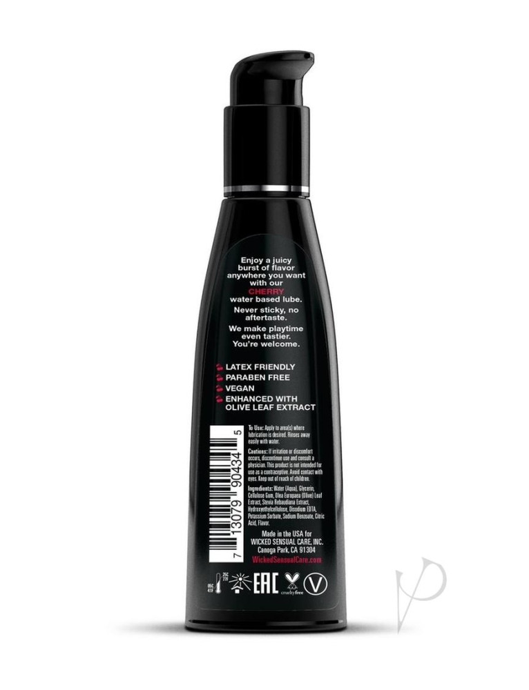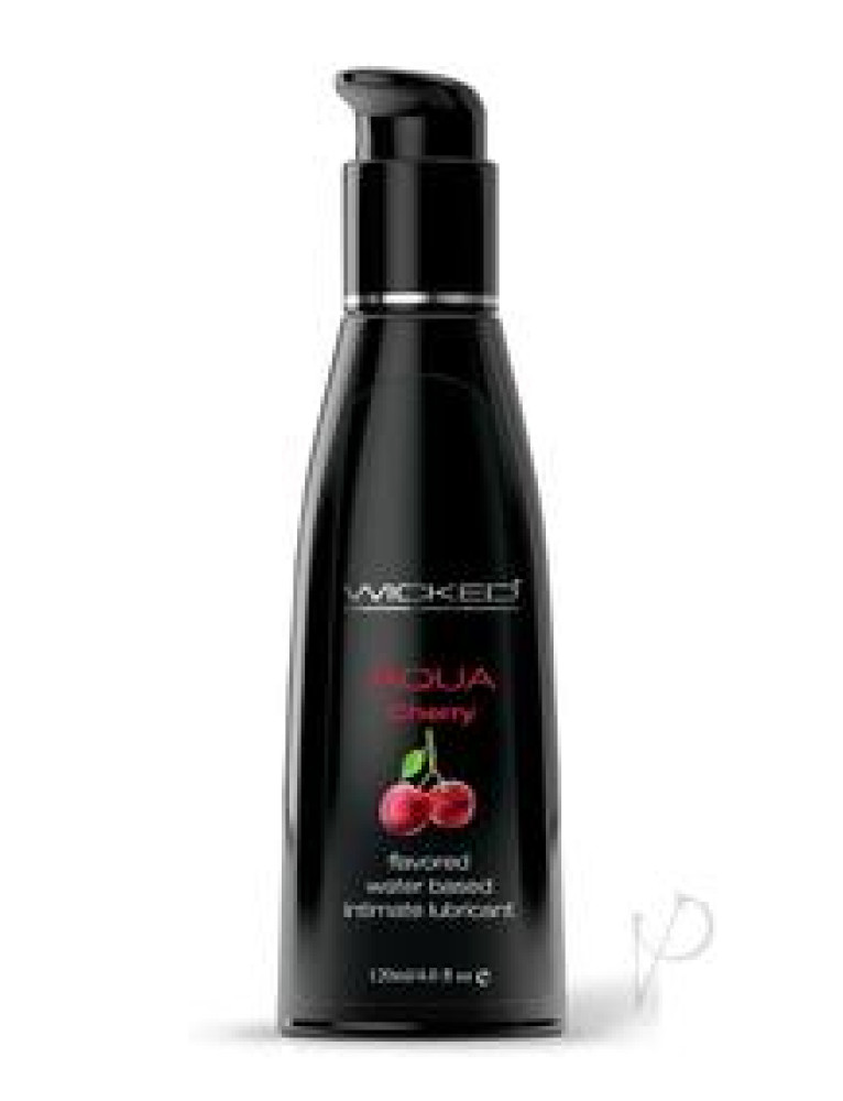 Keep calm and cherry on! Kissable, lickable, and delicious, Wicked Aqua Cherry personal lubricant adds subtle and delicious natural flavors to enhance oral pleasures. Light and silky, this water-based formula is the perfect sensual combination of an elegant lubricant and a flavor sensation. Never sticky and without an aftertaste, Wicked Aqua Cherry satisfies your sweet tooth and your intimate desires all in one amazing pleasure product. Oral sex never tasted so good. Whether you are giving or receiving, our flavors will give you a new sexy confidence. Long LastingLatex FriendlyParaben FreeNever StickyNo AftertasteEnhanced with Olive Leaf ExtractVegan- No Animal By-products or testing Directions:Apply to area(s) where lubrication is desired. Cleans away easily with water. Ingredients:Water, Glycerin, Cellulose Gum, Stevia Rebaudiana Extract, Olea Europaea (Olive) Leaf Extract, Hydroxyethylcellulose, Tetrasodium EDTA, Citric Acid, Sodium Benzoate, Potassium Sorbate, Flavor