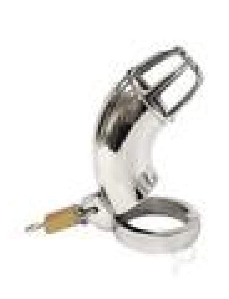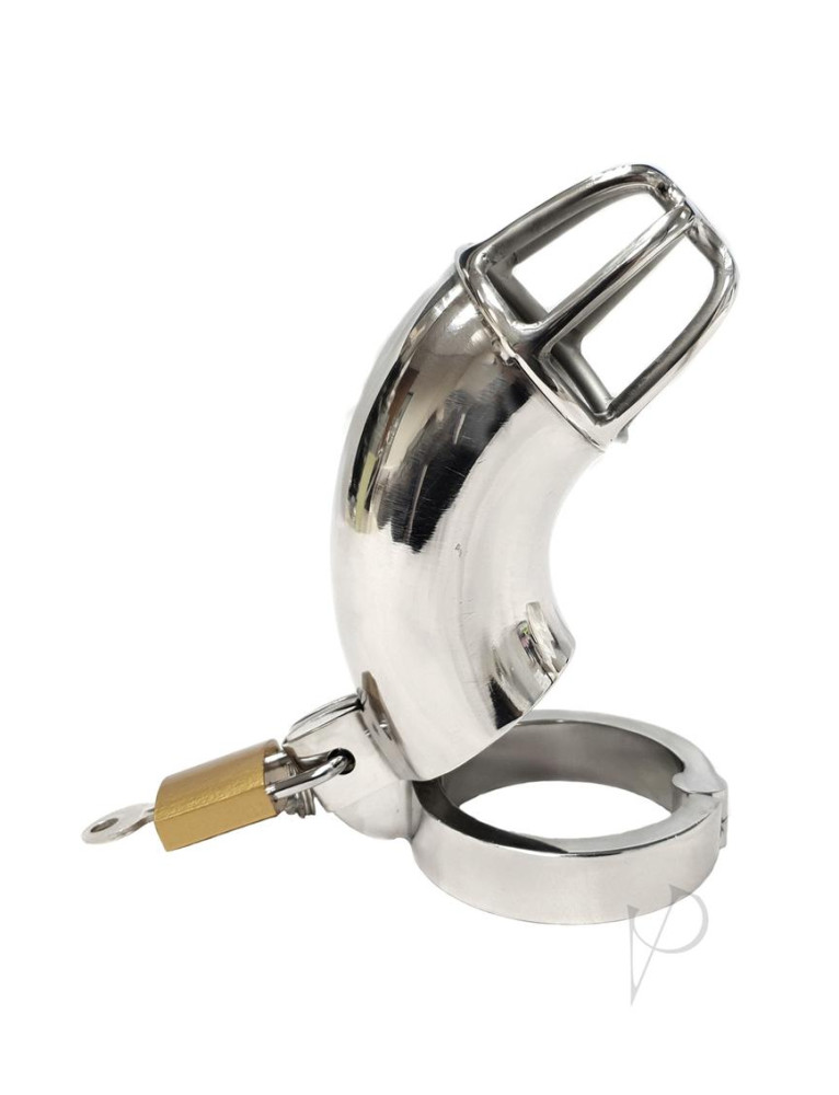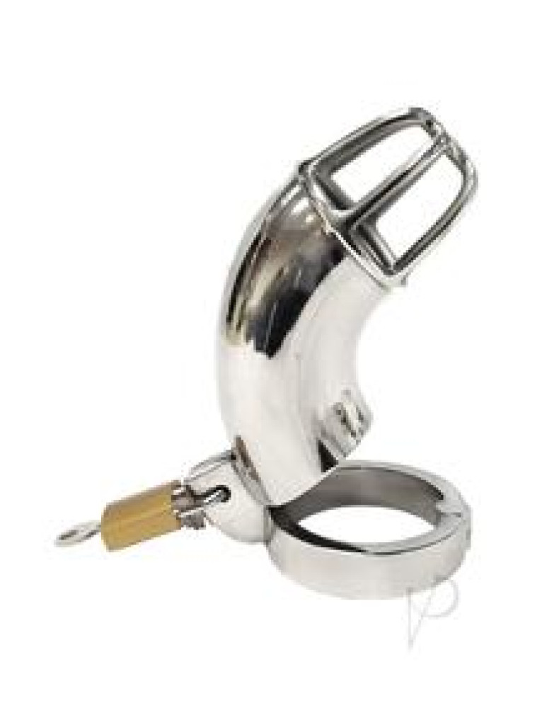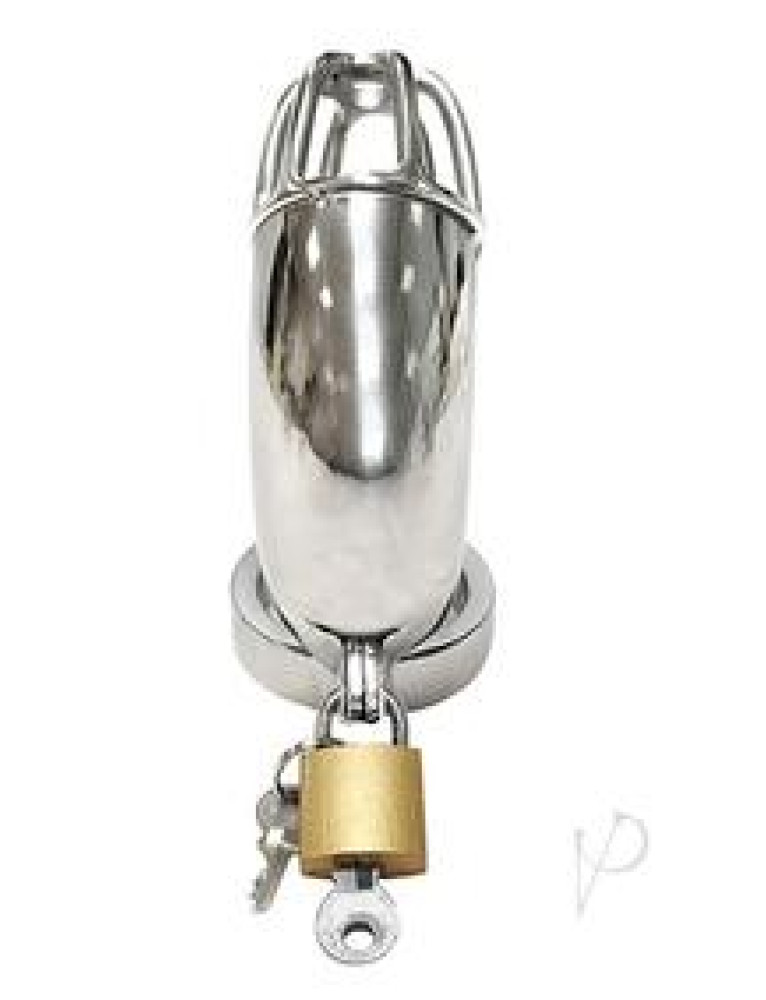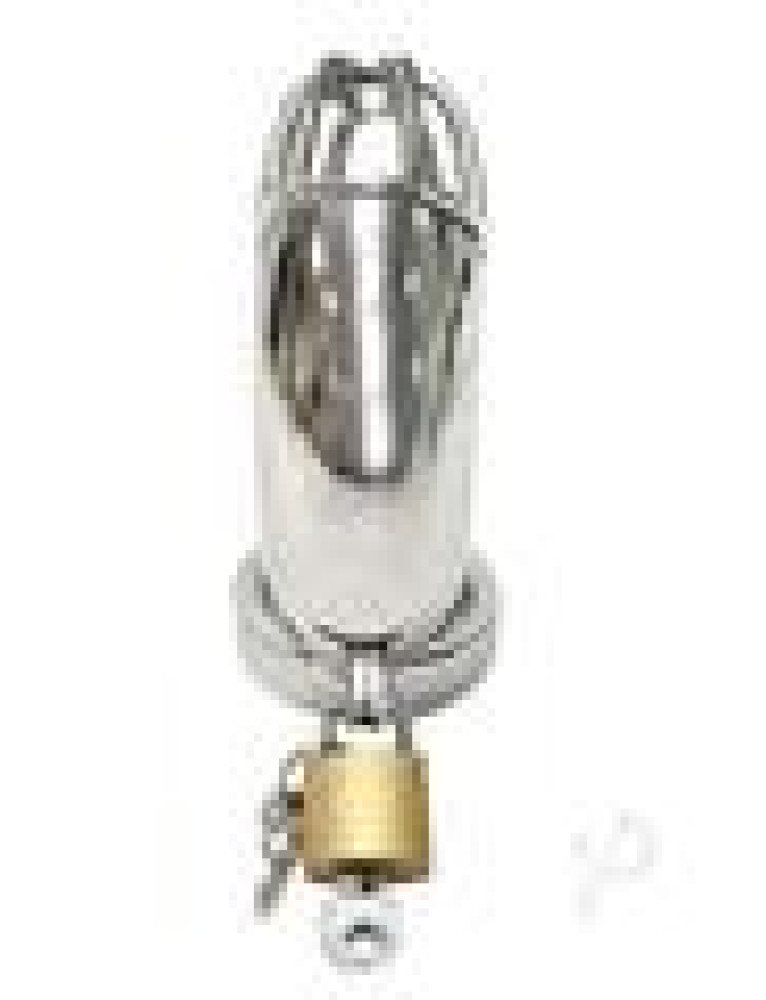 Stainless Steel Chastity Cock Cage complete with padlock.The open cage makes it easier for fluid to pass comfortably. Cock ring is 1.57 in. and cage is 6 in.