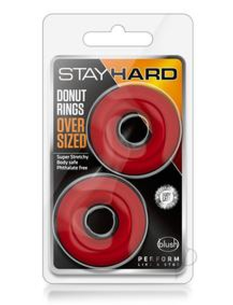 Perform like the stud you are! These Stay Hard Oversized Donut Rings are the larger versions of our bestselling Donut Rings. 33% thicker to be exact. They are a simple seductive add on to prolong your erection so you can prolong your sessions with your partner! Stay Hard cock rings provide amazing benefits as these can be used around the shaft or both the shaft and at the base of the testicles to increase both your size, length, girth, thickness. It can also increase your stamina, improving your sex life. Made from our proprietary blend of super stretchy TPE Elastomer for your safety and hygiene during your intimate play. Each ring measures .5 Thick x .75 Inner Width. Stretches Up To A Maximum Width of 4 x 1.7 Outer Width. So pick up this Oversized Donut Ring set by Blush tonight, you and your partner will love your bigger, harder erection that lasts longer!MALE ENHANCEMENT - Retains Blood Flow In Your Penis To Make Your Dick Longer, Harder, Bigger. Enjoy Longer Lasting Erections And More Intense OrgasmsPLEASURE YOUR PARTNER - Increase Stamina And Armed With A Harder Dick You Will Deliver Mind Blowing Orgasms To You And Your PartnerBIGGER IS BETTER - With Restricted Outflow Of Blood Your Penis Will Be Engorged. Lengthen Your Rod. Add Girth. Fulfill Your Partner`s Darkest Desires. Become A StudVERSATILE - Wear Both at Once, Stacked. Wear At The Base Of Your Testicles To Delay Ejaculation Or Just To Experience The Pleasure Of A Good Stretch Of Your NutsPEACE OF MIND - Responsibly Made By Blush. We Care About Your Health And Wellness And Are Mindful Of What We Provide For Your Body. Lab Tested and Certified To Contain No Phthalates, BPA Or Other Harmful Substances. Silicone, Water Based and Hybrid Lube Safe. Measures .5 Thick x .75 Inner Width. Stretches Up To A Maximum Width of 4 x 1.7