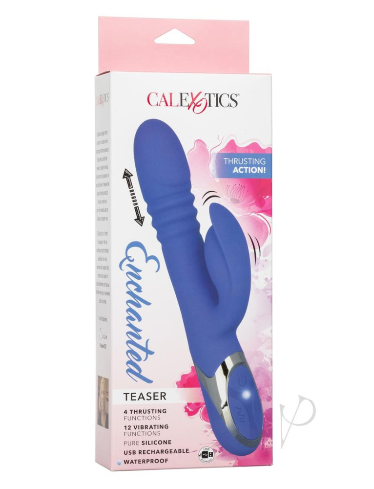 Bring a little magic to your bedroom with the Enchanted Teaser. Transport yourself to a wonderland of pleasure with 4 functions of shaft rotation, 4 functions of thrusting action, and 12 indulgent vibration functions. The flexible shaft and flickering stimulator move with your body to deliver intense G-spot and clitoral stimulation. The seamless silicone body and self-healing charging port allow for powerful stimulation in and out of the water. Recharge the premium silicone massager in 120 minutes with the provided USB charging cable to enjoy 50 minutes of high-speed stimulation or 65 minutes of low speed vibrations. While the easy-touch button pad controls the intensity and the curvaceous vibe gives you the stimulation you want, the integrated state of the art memory chip remembers just how you like it by starting on the last function used. The hypoallergenic premium silicone is body safe, unscented and phthalate free to keep you most sensitive spots, happy and healthy. Dimensions: Shaft: 5 x 1.5 in. Stimulator: 3.5 x 0.75 in. Package: 1.75 x 4 x 11 in.